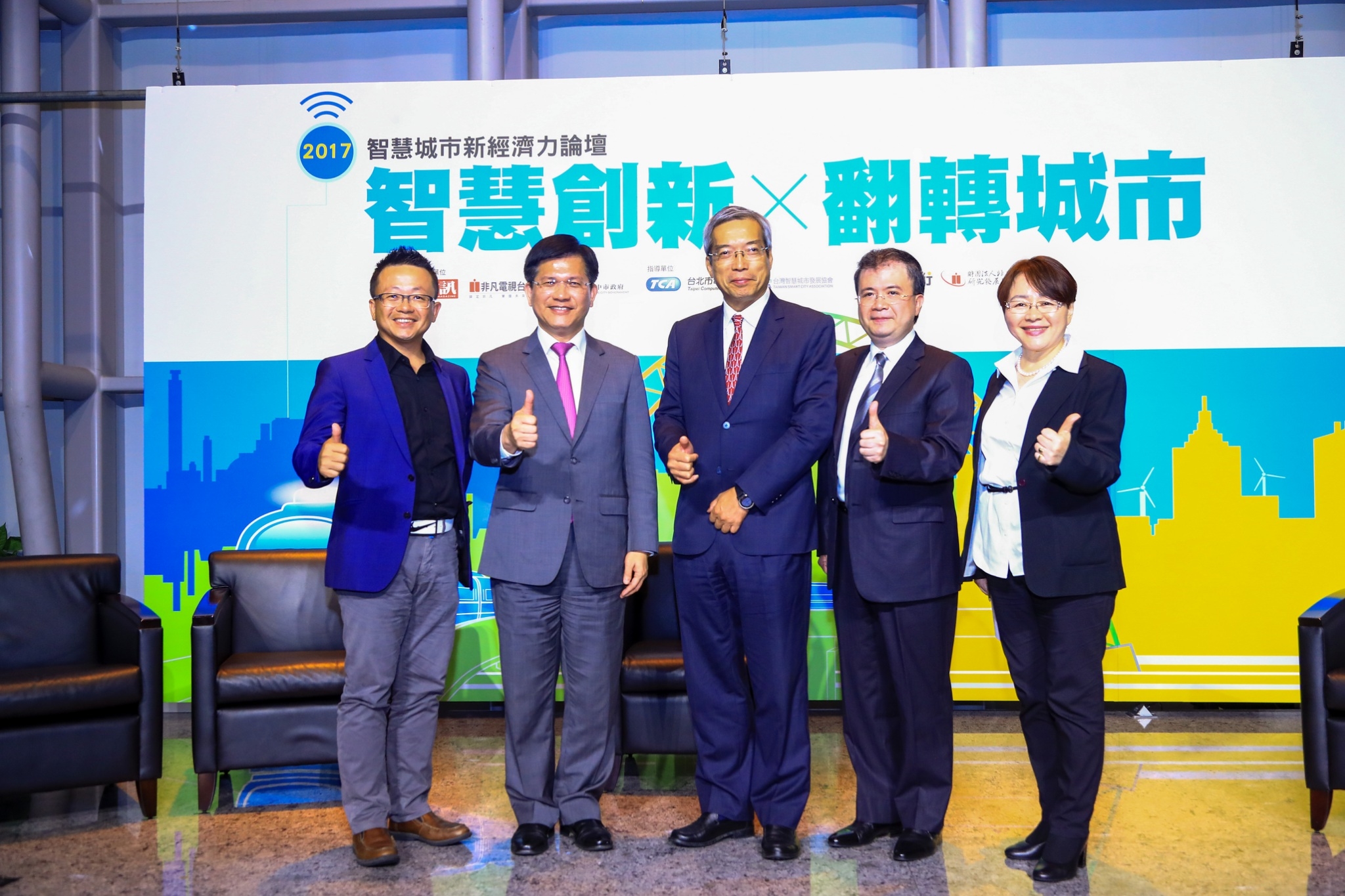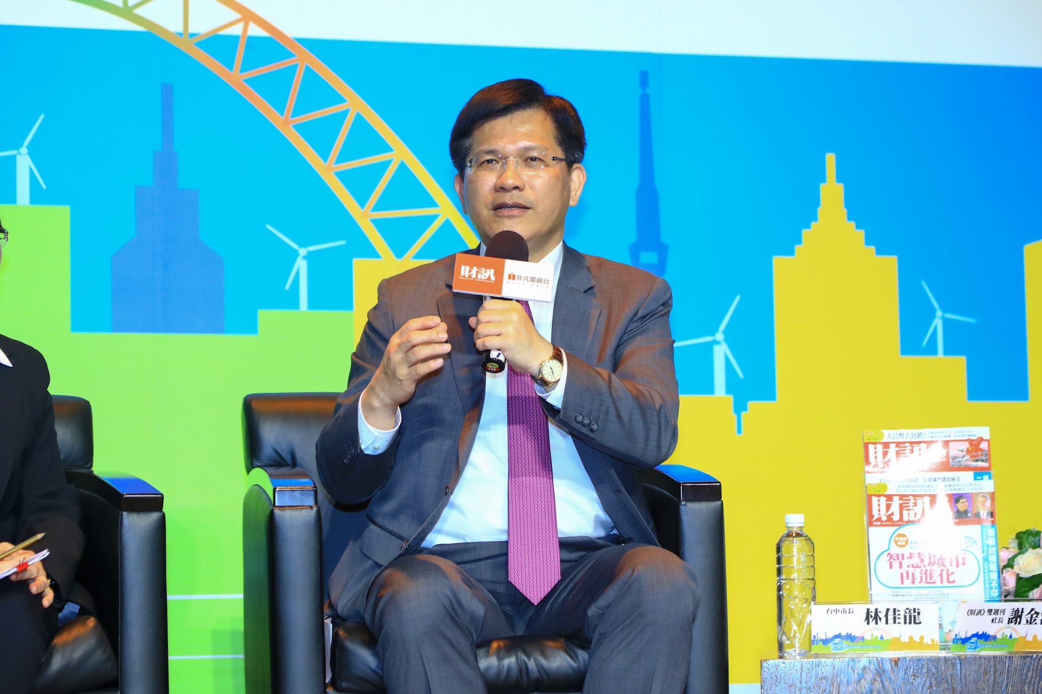 今年智慧城市新經濟力論壇台中場以「智慧創新x翻轉城市」為題,由《財訊》雙週刊社長謝金河主持,市長林佳龍、創新產業代表帆宣系統科技董事長高新明、皇輝科技執行長張智強與微程式資訊總經理吳騰彥等人共同交流,暢談智慧城市規劃願景與產業創新應用的經驗,經濟部中小企業處副處長胡貝蒂也到場關心,現場互動相當熱絡。