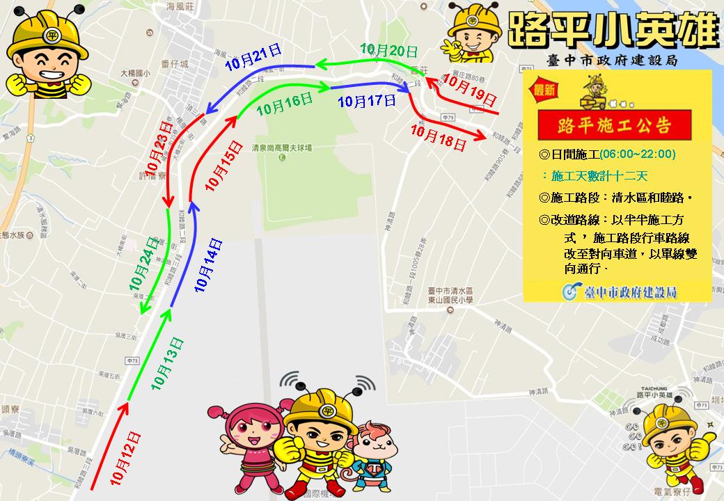 台中市政府建設局明(12)日起至24日,進行清水區和睦路從和睦路一段960巷至橋頭寮溪段,總長約5.638公里的路平工程,採「半半施工」方式降低交通衝擊,預計10月底可完工,為海線居民再添一條平坦舒適的道路。