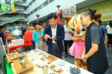 活動現場也有18位青年設攤展示創業成果,林市長逐一到各攤與創業青年暢聊,對青年展示的產品也深感興趣。「好精緻!」林市長新奇地拿起以錫製成的鍬形蟲仔細端詳;另外,他也和台中世界花博吉祥物「樂虎」姐姐現場PK打紙製保齡球,比賽結果讓他直呼:「她拿9分我才拿2分!」最後,林市長還當場騎上現場展示的大型「模鐵鹿」模型,笑說:「我好像騎著馴鹿,要去送禮物。」