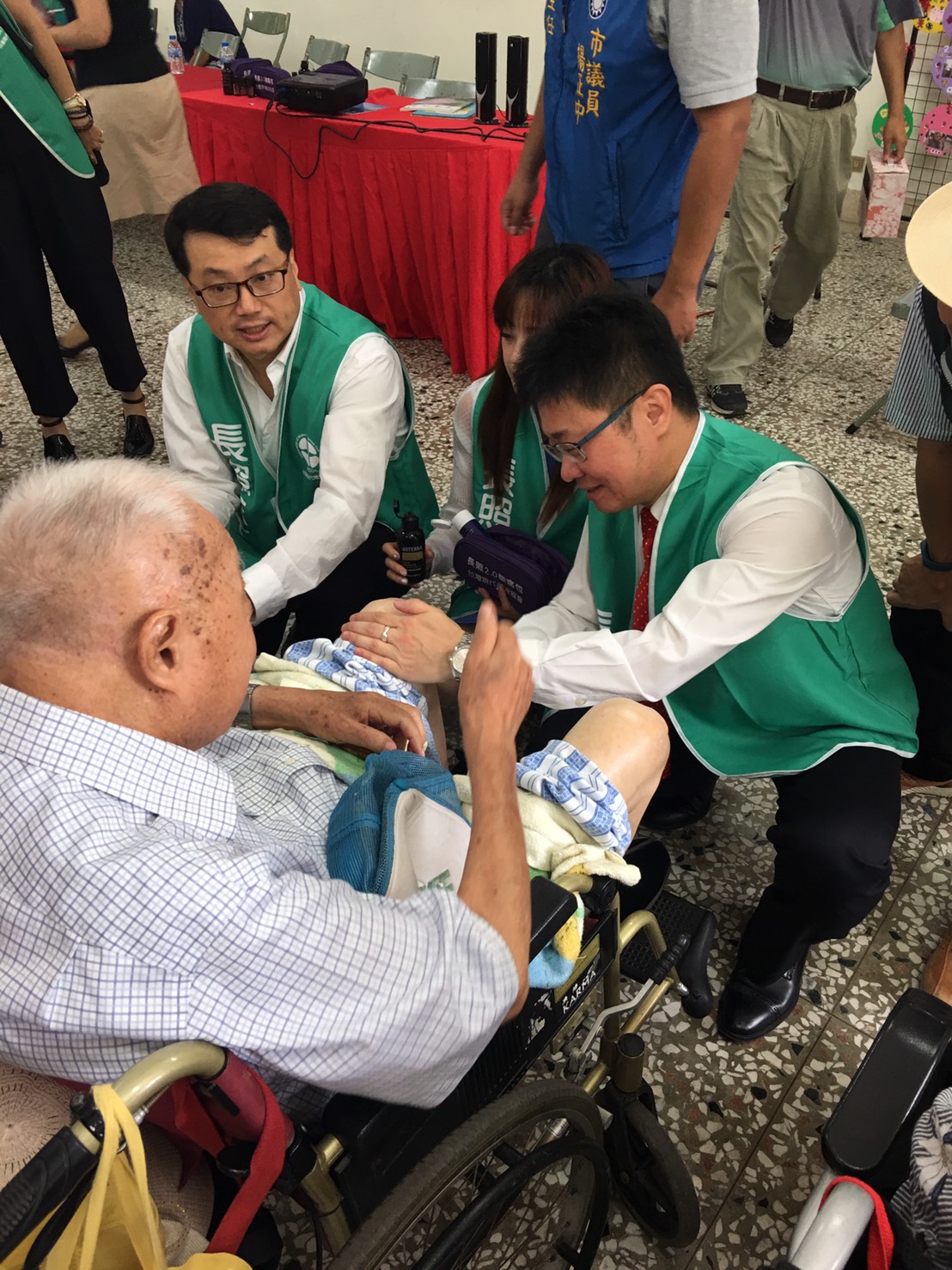 志工王添雄因心肌梗塞做了冠狀動脈繞道手術,深刻體會到活著真好,病癒後,他想要多做些有意義的事來幫助別人,這次參與公益活動,希望將在病中幫助他迅速痊癒的精油,也分享給每一位有需要的阿公阿嬤。