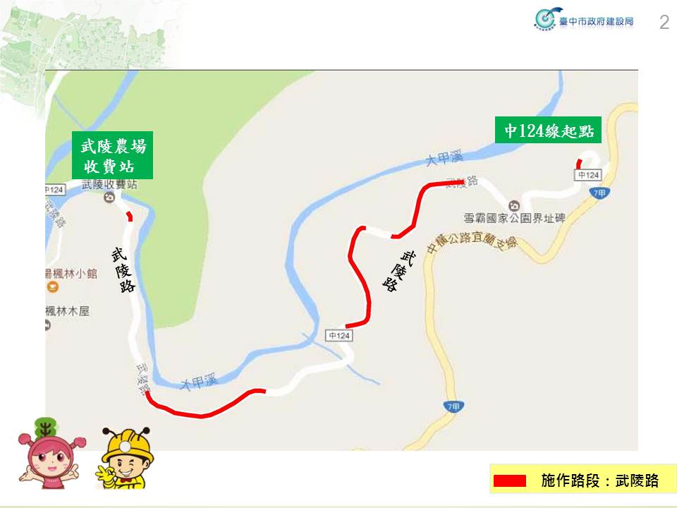 為此,市府將這兩條道路納入路平專案,規劃改善武陵路(中124線)自省道台七甲線至武陵農場收費站前,以及福壽路(中131線)自梨山文物館至福壽山農場入口;更特別針對既有邊坡擋土牆及水溝損壞部分,一併納入路平工程中辦理修復。