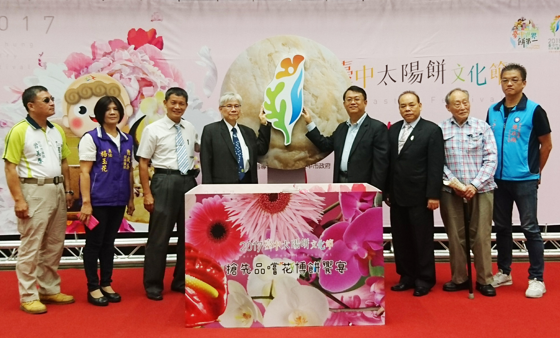 今(18)日太陽餅文化節行銷記者會,由經發局長呂曜志、工商發展投資策進會總幹事蔡世寅、台中市糕餅商業同業公會理事長周子良、市議員劉士州以及多家糕餅業者共同將花博LOGO放置在糕餅圖像上,象徵今年以花入餅的主題特色,並宣布一年一度的太陽餅文化節即將登場,