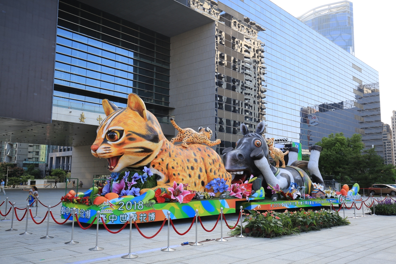 台中石虎花車以2018台中世界花卉博覽會吉祥物為主題,打造全長19公尺、高5公尺的花車,前車由台中花博吉祥物石虎媽媽「虎媽」領軍,後車則是由鄰居老馬「歐米馬」坐鎮。「虎媽」有著長長的眼睫毛,不斷眨眼「放電」,後車「歐米馬」被石虎姊弟「樂虎」、「來虎」捉弄,仆倒在地,氣得鼻孔直噴煙。