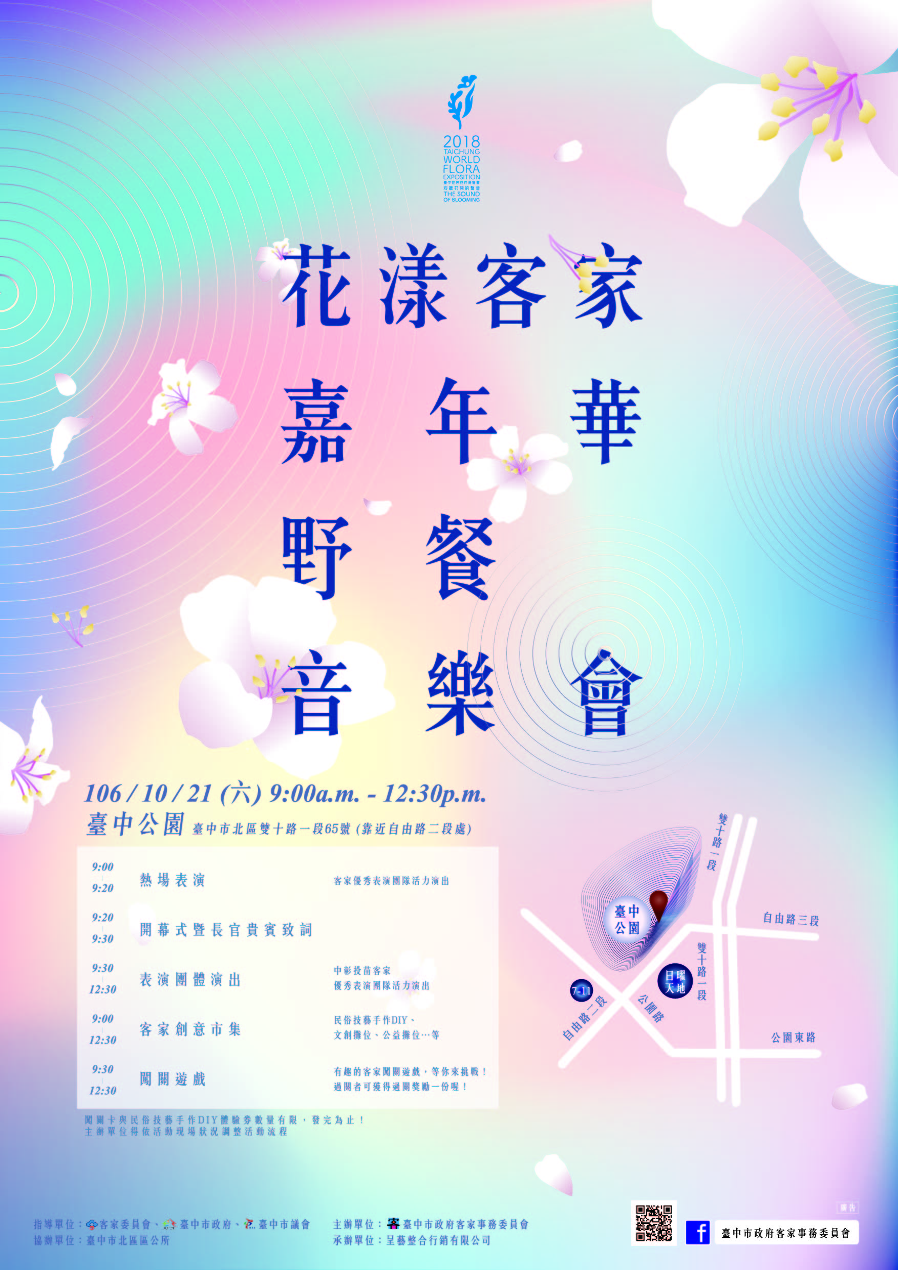 10月21日上午9時在台中公園將有「花漾客家嘉年華~野餐音樂會」,節目精彩可期,歡迎攜家帶眷一同前來,花現文化的花園,花現內心的花園!