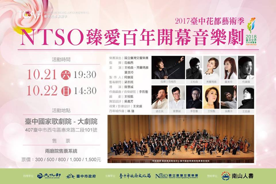 「2017台中花都藝術季」今年活動開幕劇《NTSO臻愛百年開幕音樂劇-回家》由國台交及台師大表演藝術暨華文音樂劇中心攜手,詩人路寒袖特別創作《百年城》,音樂大師林強作曲,製作陣容包括藝術顧問梁志民、導演曾慧誠、編曲暨音樂總監李哲藝、編劇王悅甄、舞蹈設計吳義芳、視覺暨影像設計王奕盛、舞台設計陳瓊珠、燈光設計陳昭郡及服裝設計彭郁勻等。