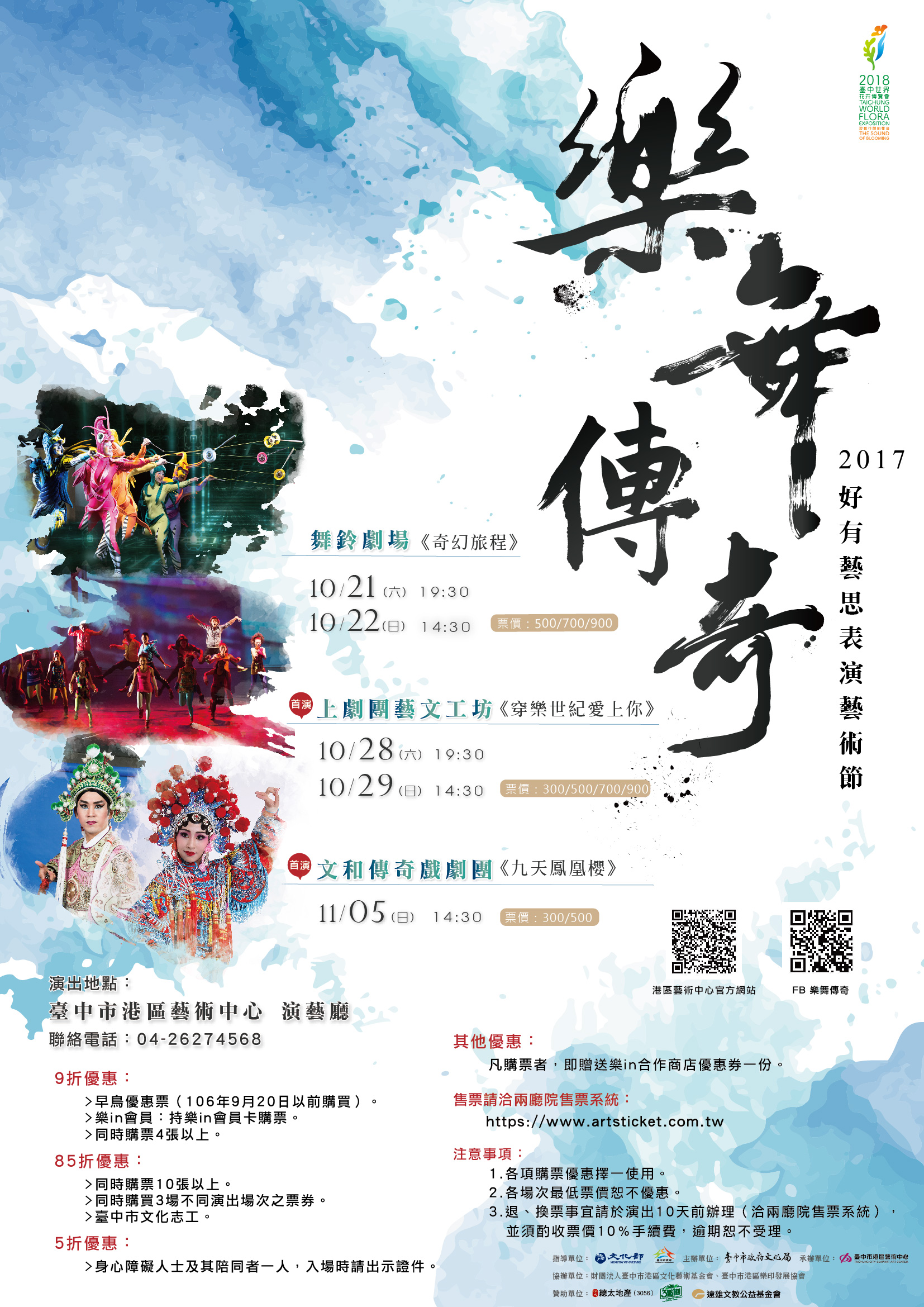 此外,週六(21日)起在港區藝術中心「2017好有藝思表演藝術節-樂舞傳奇」將登場,分別由「舞鈴劇場」、「上劇團藝文工坊」及「文和傳奇戲劇團」連續3個週末將帶來5場精彩演出;其中,上劇團與文和劇團將以台中故事為主軸,帶來全台首演新作,即日起售票,並提供套票優惠。活動詳情可至港區藝術中心官網( http://bit.ly/2xSfWhM  )或「2017好有藝思表演藝術節-樂舞傳奇」臉書粉絲專頁( http://bit.ly/2zBi3Ue  )查詢。本週還有不少展覽、演講等活動,更多資訊,請見「中市週末活動看板1021_1022」。(10/20*6)*新聞局