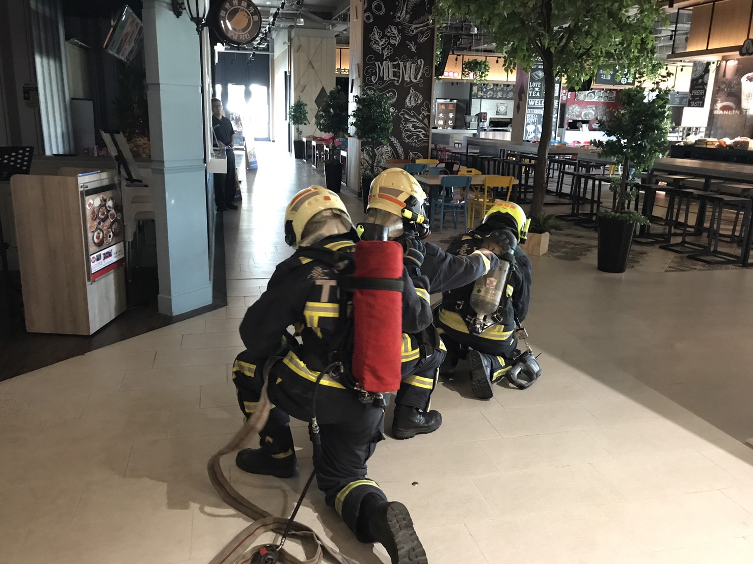 今日演練模擬商場3樓餐廳發生火警,有火煙竄出,且疑似有人員受困,消防局接獲通報後隨即趕到現場,進行任務分配、現場救災人員安全管制、人命救助、高空救援、入室搜索、防止火勢延燒、侷限火勢、滅火攻擊、殘火處理及通風排煙等,進一步建立正確的疏散、搶救及撤離模式。