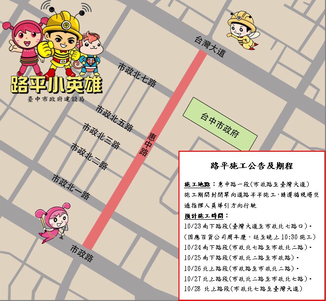 建設局長黃玉霖指出,路平專案是市府的重要政策之一,施工期間將請廠商加強宣導施工訊息,並於施工路段周邊設置大型施工警告標誌、指示標誌及通知警廣等方式加強宣導,希望降低交通衝擊,感謝市民的體諒與配合,與市府共同建設更安全舒適的用路環境。