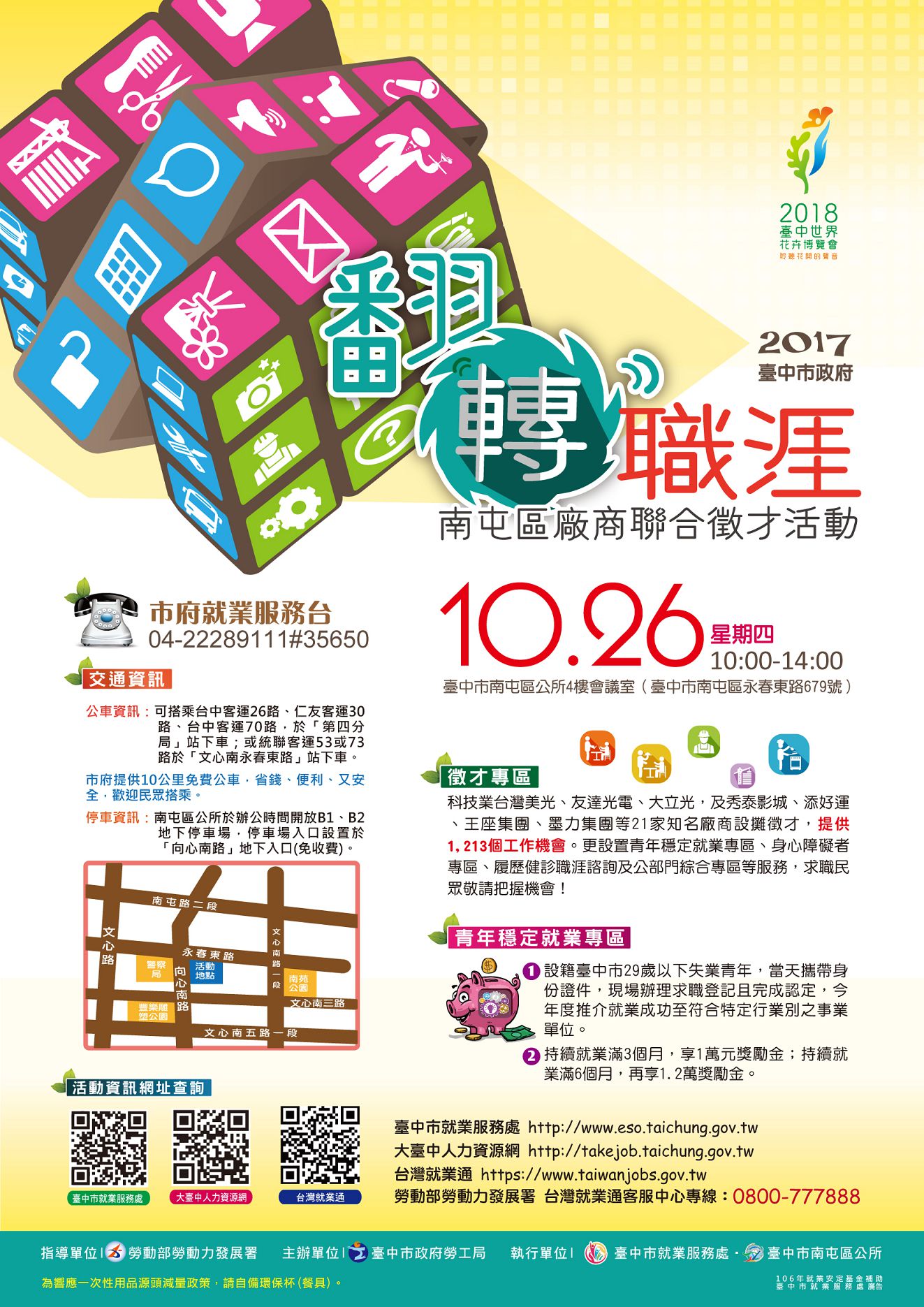 傅處長也說,為幫助青年順利就業,活動現場將設置「青年穩定就業專區」,藉由市府就業服務據點推介至特定行業別工作,任職滿3個月可領取1萬元穩定就業獎勵金,滿6個月可再領取1萬2000元,最高可請領2萬2000元;另外,現場還有「履歷健診區」提供職涯諮詢服務喔。欲知詳細活動資訊請洽詢豐原就業服務站04-25271812。(10/25*7)*勞工局