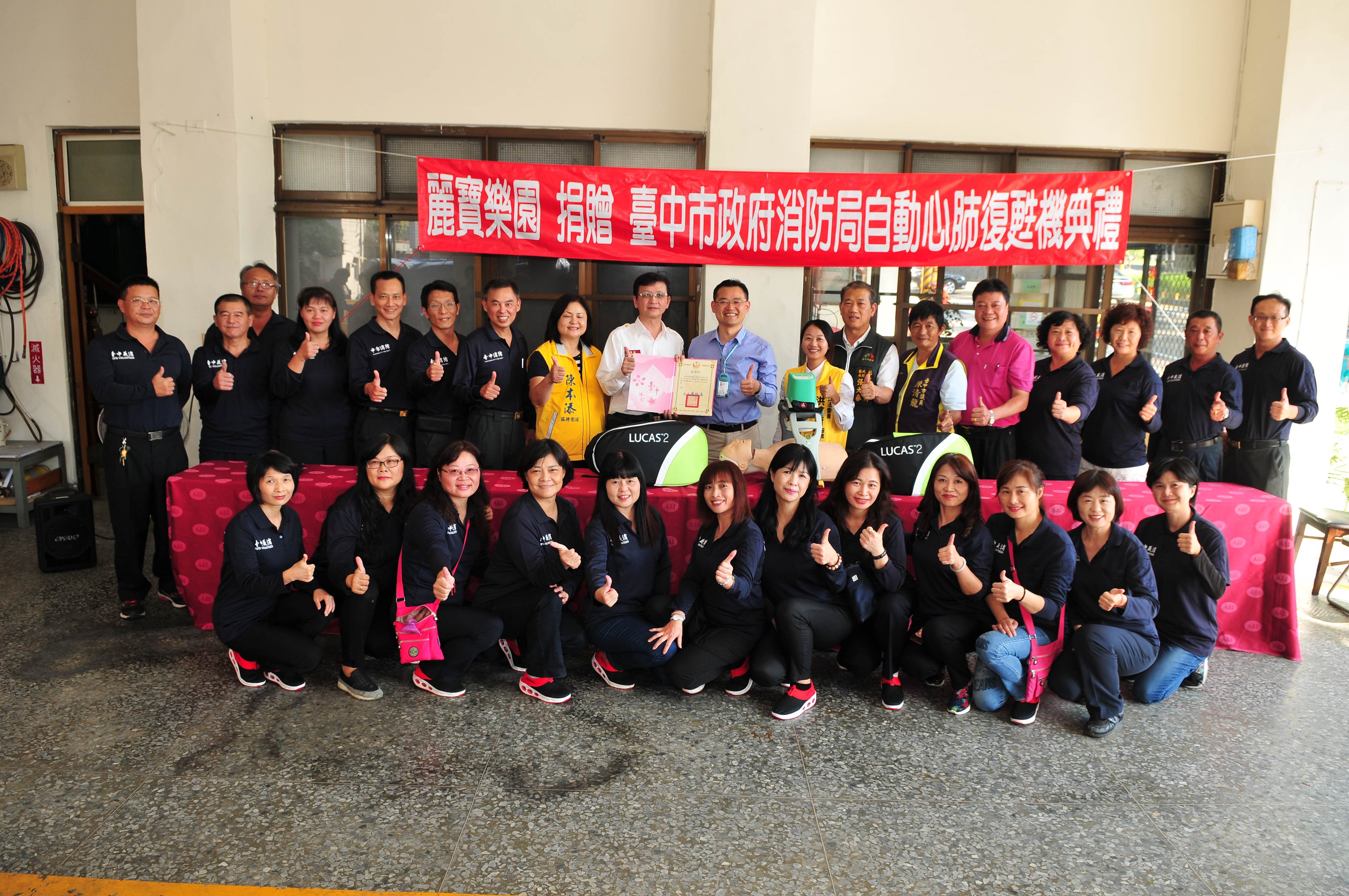 今日捐贈儀式由麗寶樂園副總經理王永豪代表捐贈,消防局主秘楊元吉代表受贈。王副總經理表示,后里區救護案件多,救護工作繁重,且后里區並無大型急救醫院,對於到院前心肺功能停止之傷患存活率影響甚鉅,因此集團決定捐贈2部自動心肺復甦機給台中市政府消防局第五救災救護大隊后里分隊,期能回饋鄉里嘉惠鄉親。