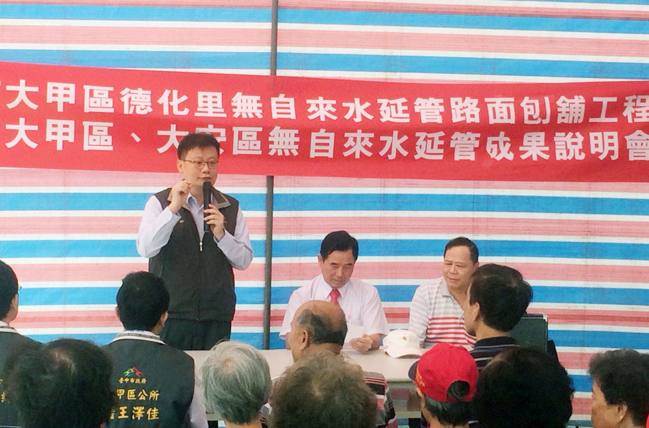 經發局李副局長表示,台中市部份偏遠地區受限於自來水系統供水能力不足,或因位處高地自來水無法到達等因素,仍然有民眾無法使用自來水,但由於自來水與日常生活息息相關,市長林佳龍上任後積極推動自來水延管工程,迄今已爭取到中央補助經費超過5億5千萬元,另市府同步配合籌編約1億8千萬元路修費用。