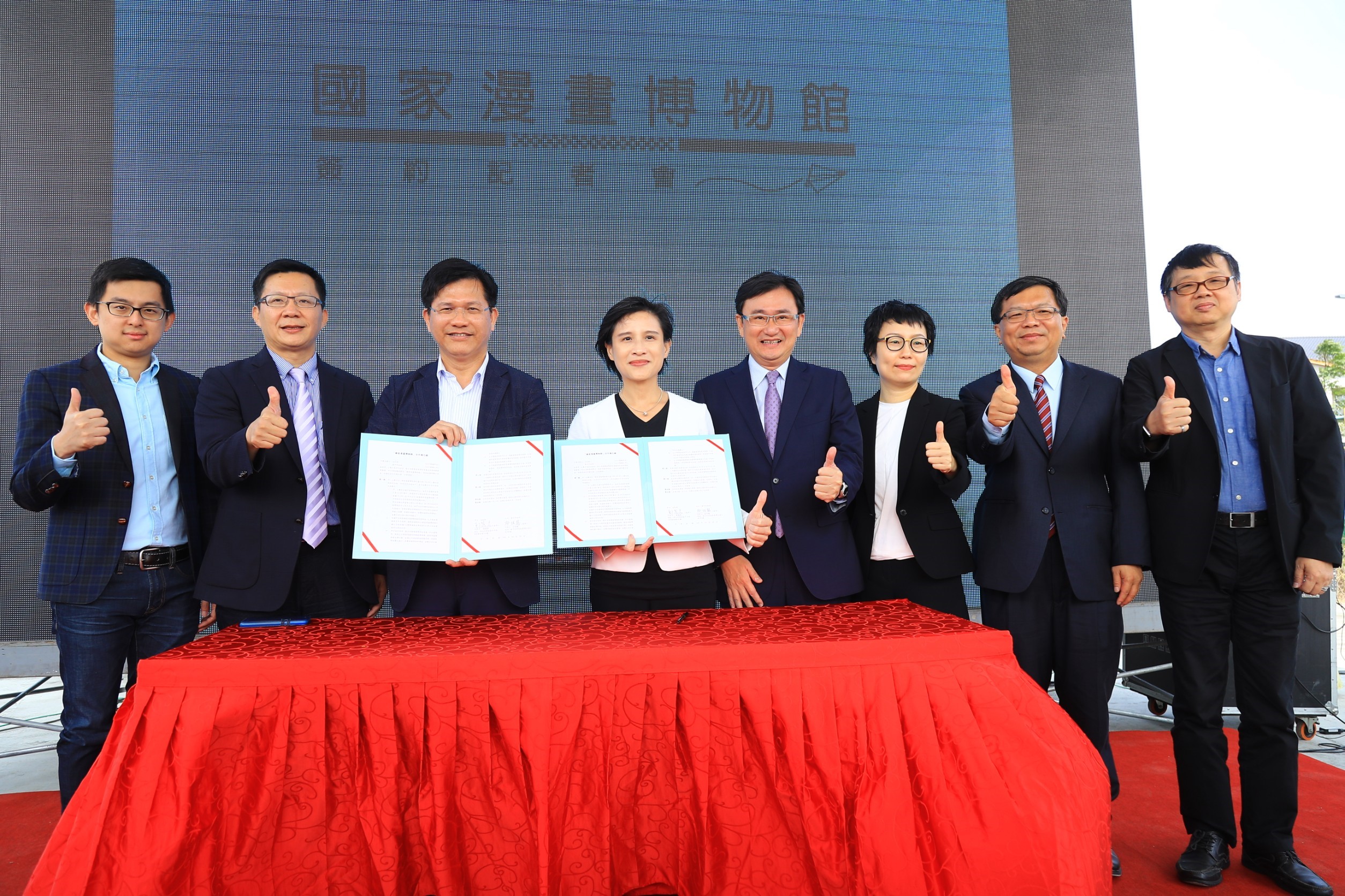 今(28)日備忘錄簽署儀式,包含市長林佳龍、文化部長鄭麗君、政務次長丁曉菁、常務次長李連權、文化部人文及出版司長朱瑞皓、市府新聞局長卓冠廷、立法委員張廖萬堅、黃國書、市議員賴佳微、陳成添、台中市漫畫從業人員職業工會理事長洪育府、台灣動漫畫推廣協會祕書長蔡尚霖、國立交通大學浩然圖書館副館長黃明居、資深漫畫收藏家洪德麟、紀厚博,以及蕭言中、翁瑜鴻(HOM)、卓宜彬(鐵柱)、米米、TK章世炘等眾多漫畫家皆蒞臨,市議員陳政顯、蔡雅玲,也派代表到場。林市長與鄭部長簽署合建「國家漫畫博物館」合作備忘錄後,並現場欣賞在地漫畫創作,漫畫家也致贈Q版漫畫予兩人,氣氛熱絡。