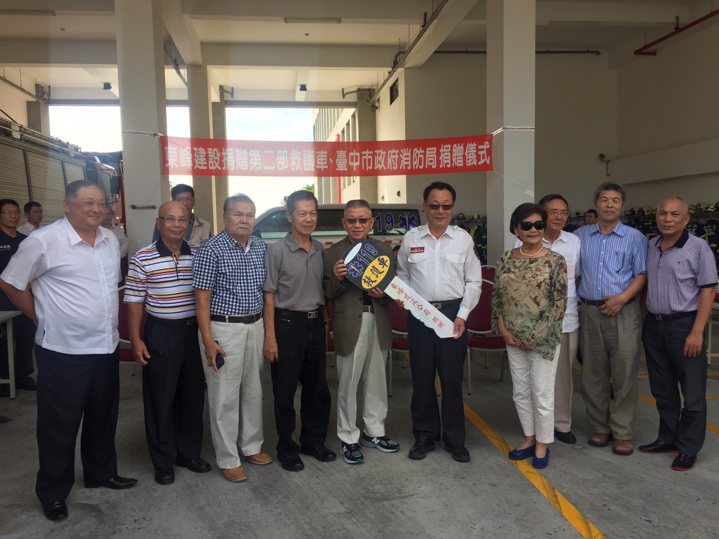 捐贈儀式今日在市府消防局第三救災救護大隊中山分隊舉行。消防局副局長曾進財代表市長林佳龍頒發感謝狀給東峰建設股份有限公司,感謝他們秉持人溺已溺、人飢已飢的精神,繼去年捐贈後,再捐贈一輛價值293萬元救護車協助救護人員執行到院前救護工作,讓台中市緊急醫療體系更加完善。