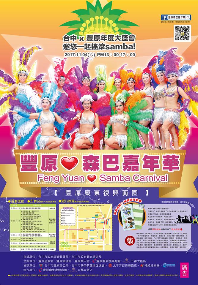 「2017豐原森巴嘉年華」將在11月4日舉行,今年活動主舞台設於豐原火車站西側站前廣場,遊行路線自火車站繞行豐原廟東復興商圈,串連在地店家及企業團體,規劃熱情森巴嘉年華及同步發行「豐原護照好好玩」;護照內容網羅豐原周邊景點及購物、小吃推薦,還可兌換限量活動專屬紀念胸章及單筆消費100元以上可蓋1枚活動章,集「九宮格集章樂」3格可換1張摸彩券,獎品有高級電子琴、烏克麗麗等多項好禮。