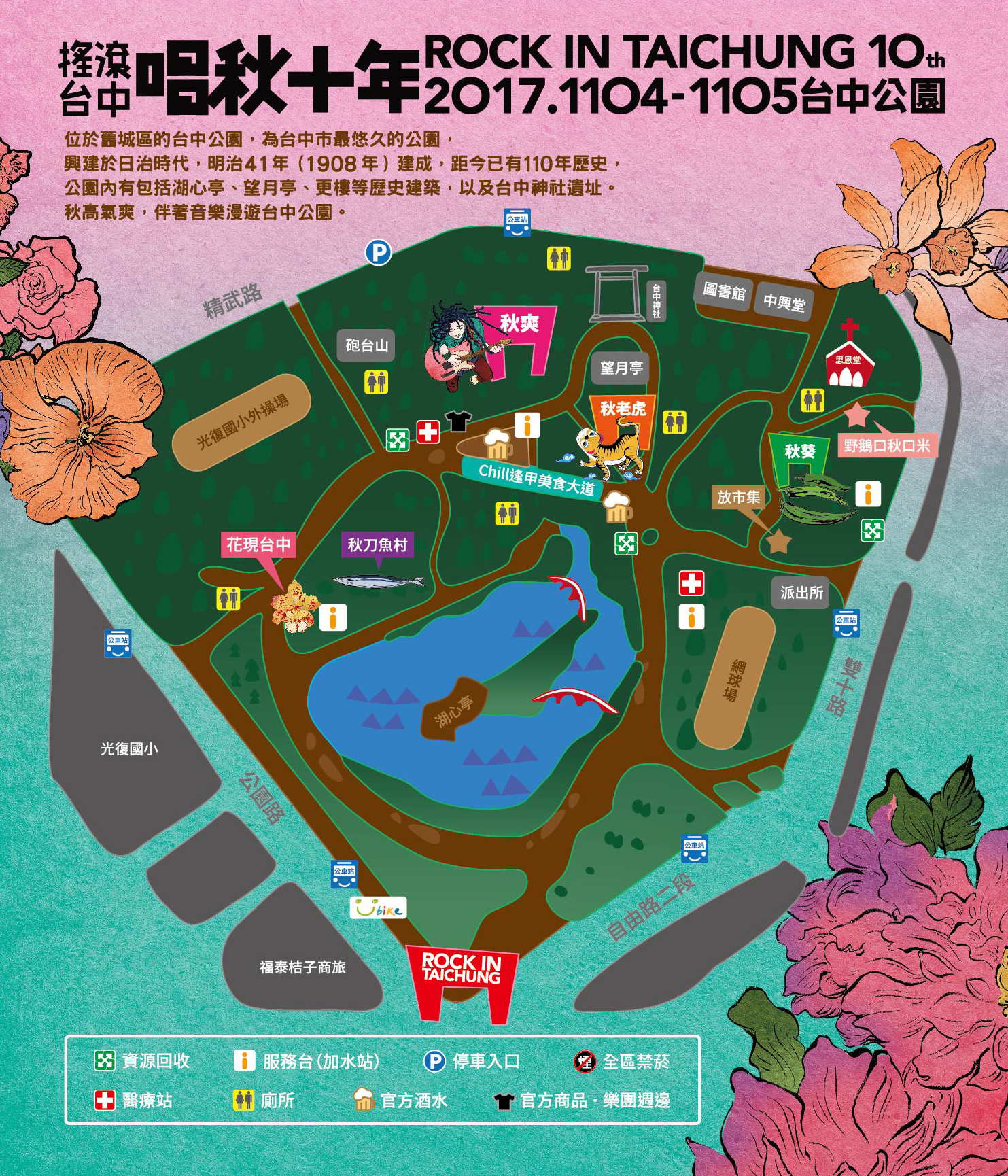 11月4、5日「唱秋十年 搖滾台中」演出卡司名單,則有麋先生、熊寶貝樂團、Hello Nico等40組樂團,陣容空前;現場還有文創市集、4D遇見花博體驗、闖關送好禮等活動。「響徹365花開迎倒數」系列活動之一的「唱響起點 花博之夜」演唱會,時間為11月3日19時至22時,地點在麗寶樂園第二停車場;「唱秋十年 搖滾台中」,時間為11月4日至5日的14時至19時,地點在台中公園。更多詳細資訊可至「響徹365 花開迎倒數」官網 ( http://bit.ly/2yBAxWo  )及「唱秋十年 搖滾台中」粉絲專頁 ( http://bit.ly/2cmMUHX  )查詢。交通資訊請見連結:http://bit.ly/2lB8UIn  。