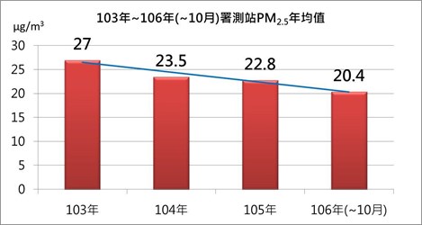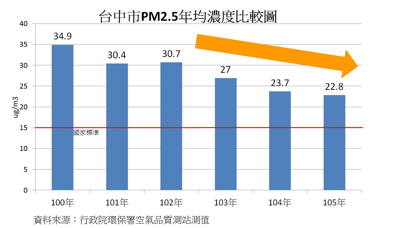 依據環保署空品測站數據顯示,台中市今年10月份PM2.5月均值下降至19.8微克/立方公尺,為自100年空污季10月份監測PM2.5數值以來最低。比起101年最嚴重的單月濃度35.9微克/立方公尺,空汙品質改善近4成,而且今年10月降雨天數僅5天,較104、105年同月的7天低。