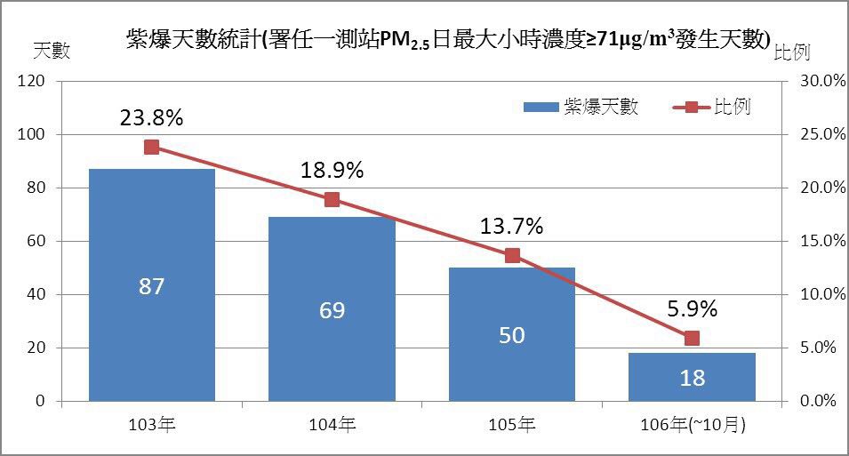 民眾通常將PM2.5濃度大於71微克/立方公尺稱為「紫爆」,而環保署統計今年10月份台中未出現紫爆數值,也創歷年來的紀錄,今年紫爆天數維持仍在18天。對此,環保局長白智榮表示,根據各項數值顯示,台中市的空氣品質較去年同期好,並持續呈現改善的趨勢,顯現市府推行空汙管制策略已逐步展顯成效。