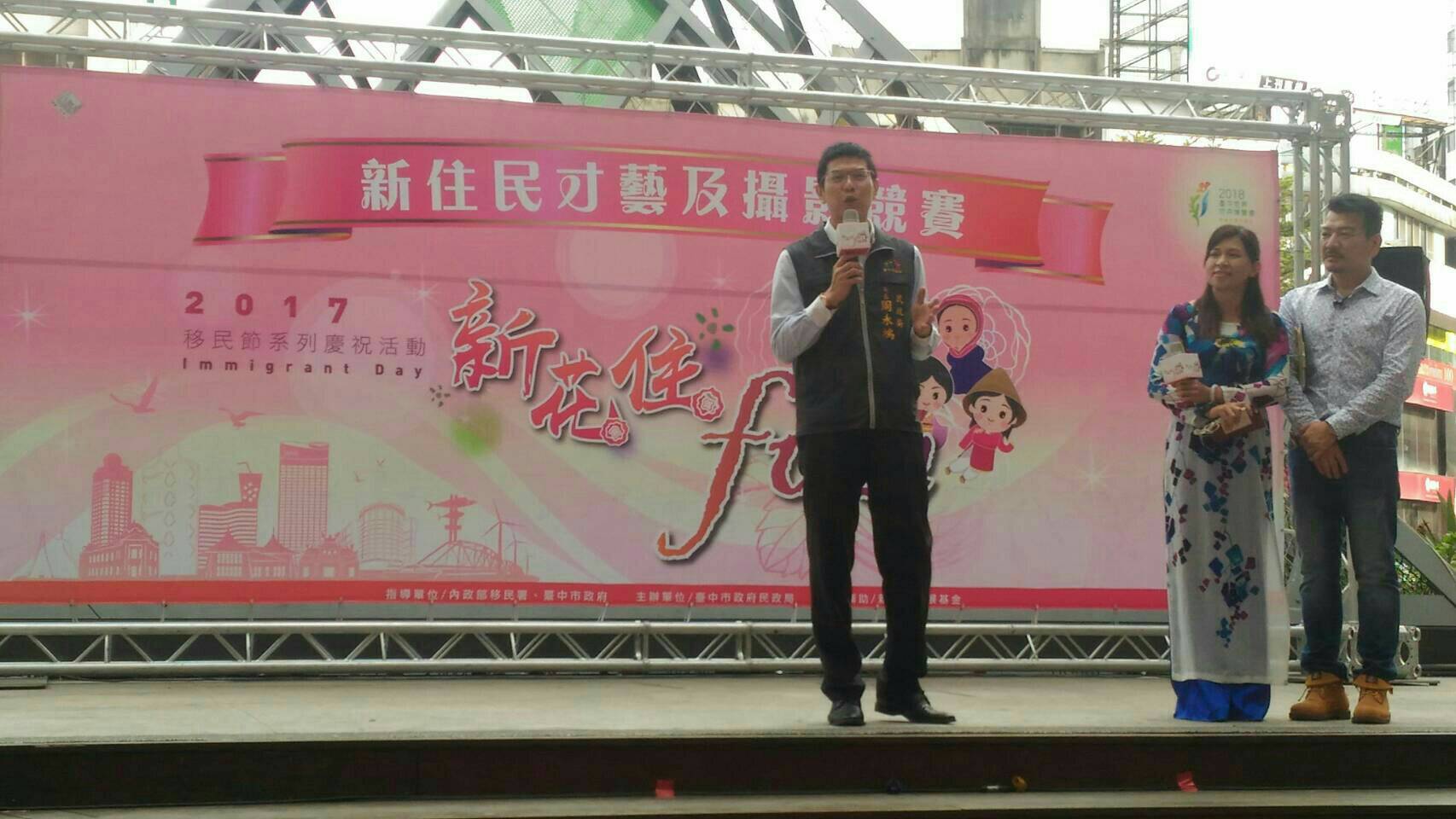 民政局長周永鴻表示,本次活動主要除促進族群間之融合與對於多元文化之尊重外,亦在培養新住民及其子女藝術之涵養,建立「新住民、新文化、新講師」之新思維,為12月3日將在南屯區豐樂雕塑公園舉辦之移民節慶祝活動揭開序幕,邀請民眾踴躍參與。(11/5*17)*民政局