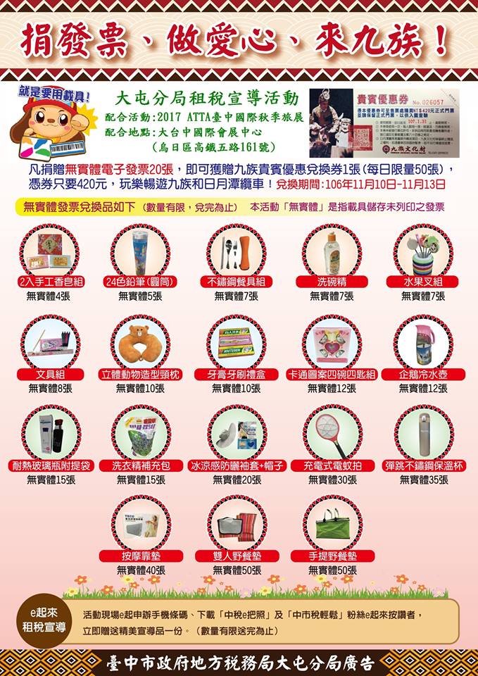 地方稅務局表示,配合台中國際秋季旅展,10日至13日上午10時起至下午18時止,在大台中國際會展中心,民眾捐贈今年9至10月、11至12月實際付款金額5元(含)以上無實體電子發票,4至50張可兌換不同好禮,包括手工香皂組、文具組、造型頸枕、充電式電蚊拍、不鏽鋼保溫杯、按摩靠墊、野餐墊等,數量有限,兌完為止。