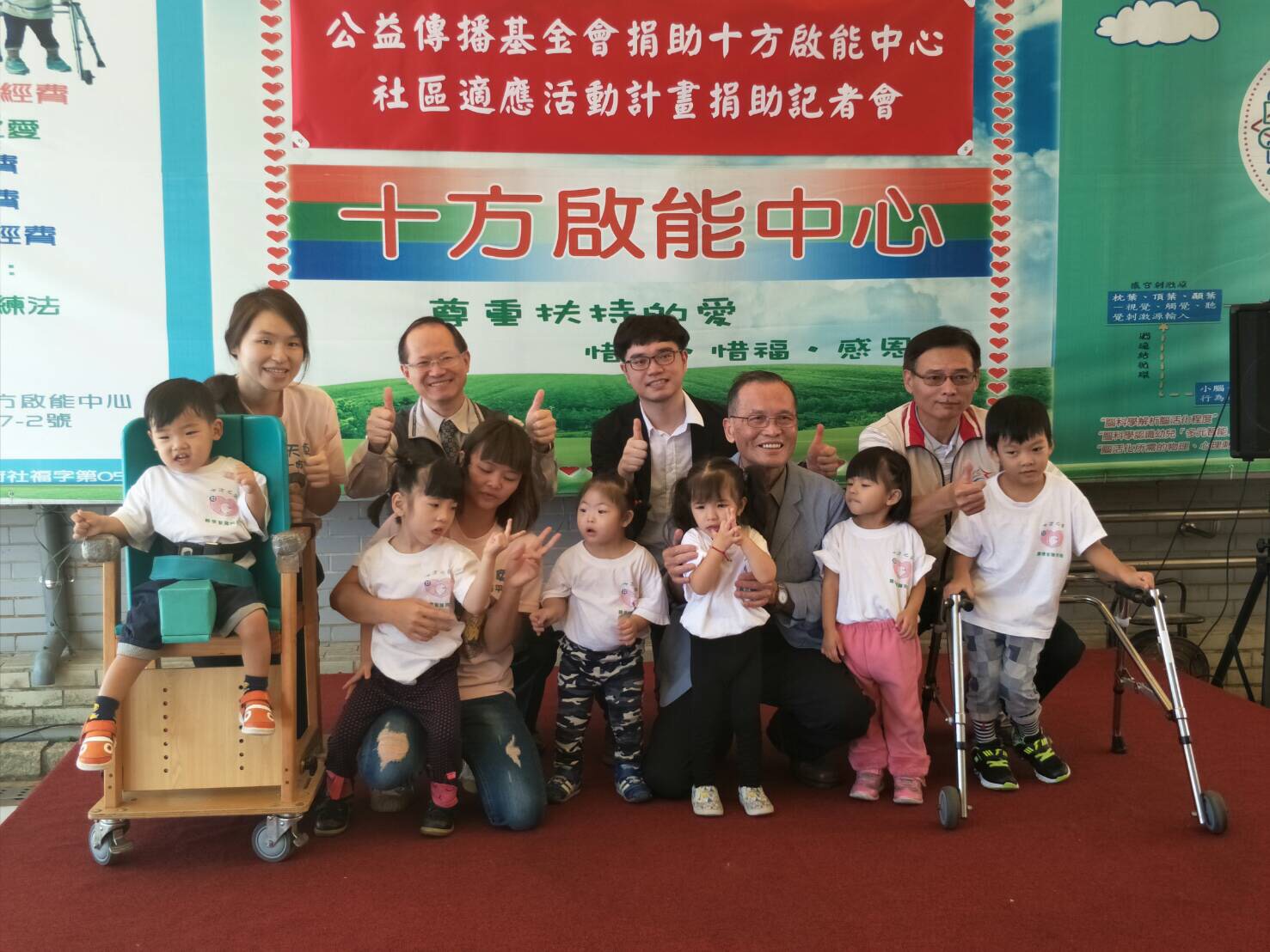 公益傳播基金會今日在十方啟能中心舉行捐贈儀式,由公益傳播基金會執行長唐平榮代表捐贈,十方啟能中心由主任游月菊與院生接受捐贈,社會局副局長陳坤皇出席擔任見證人。