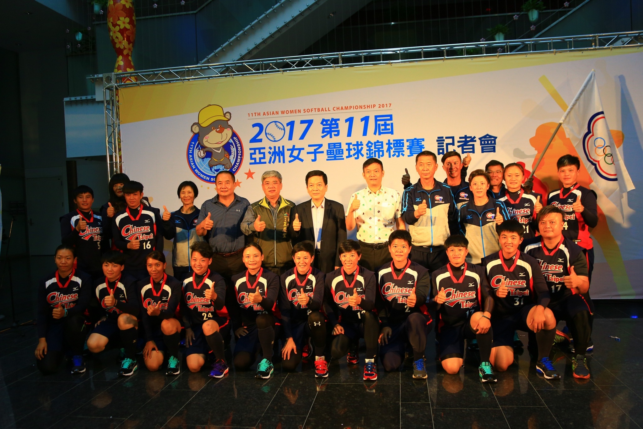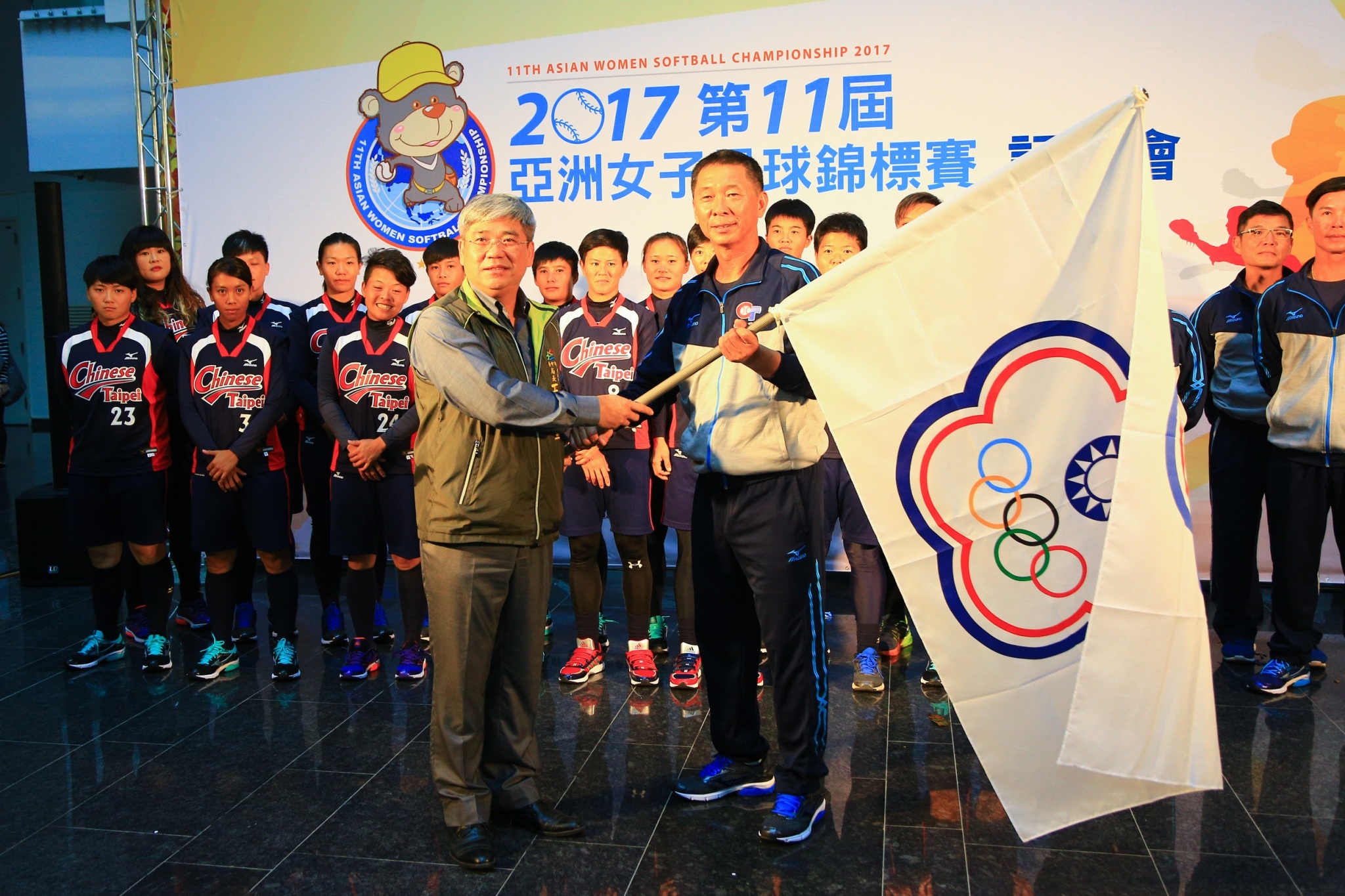 市府秘書長黃景茂、運動局長王慶堂、亞洲壘球聯合會會長潘一全、中華民國壘球協會秘書長張家興等人出席亞錦賽賽前記者會,並由運動局王局長授旗予台灣隊總教練楊賢銘,期許全隊發揮訓練成果,爭取最佳的成績。