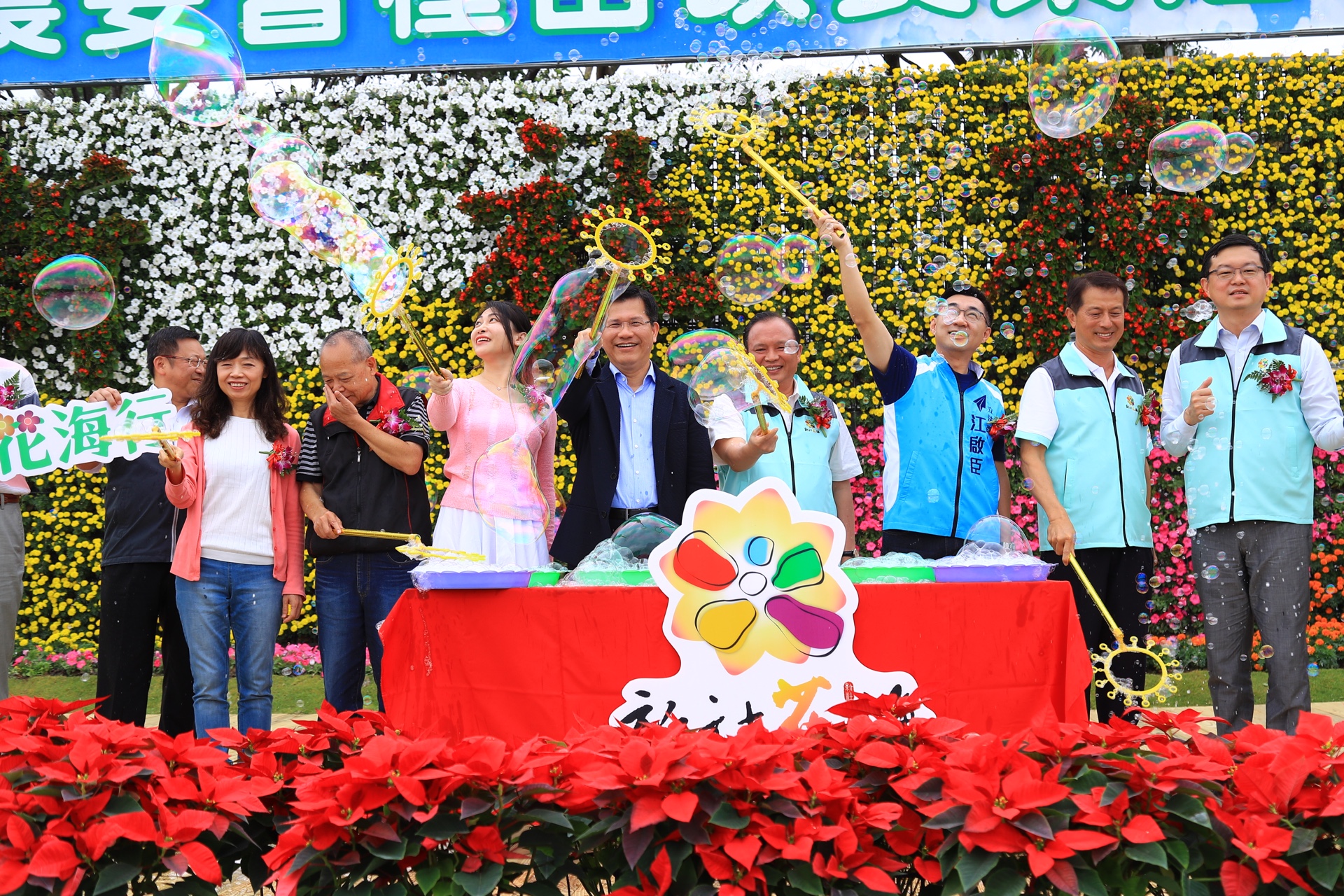 林市長今日前往新社花海參加開幕式,包括農委會主委林聰賢、立委江啟臣、市議員賴佳微、蘇慶雲、農委會種苗改良繁殖場長張定霖等人均到場,台中世界花博吉祥物虎媽也現身,一同宣告活動正式啟動,氣氛熱鬧。