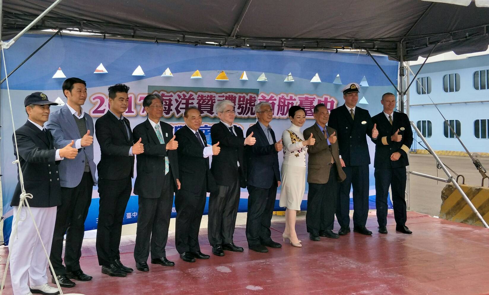 首航迎賓典禮中,副市長林陵三展示台中花博意象杯,贈予包船公司香港永安旅遊董事兼行政總裁梁港蘭及海洋贊禮號船長Henrik Loy。林副市長表示,市府在這兩年赴香港進行台中觀光推廣的效益逐漸浮現,永安旅遊回應台中的熱情,此次帶領4000名港澳遊客搭乘郵輪到台中遊玩,明年11月台中即將舉辦2018世界花卉博覽會,屆時歡迎更多港澳朋友再度搭乘郵輪來台中觀光並順遊花博。