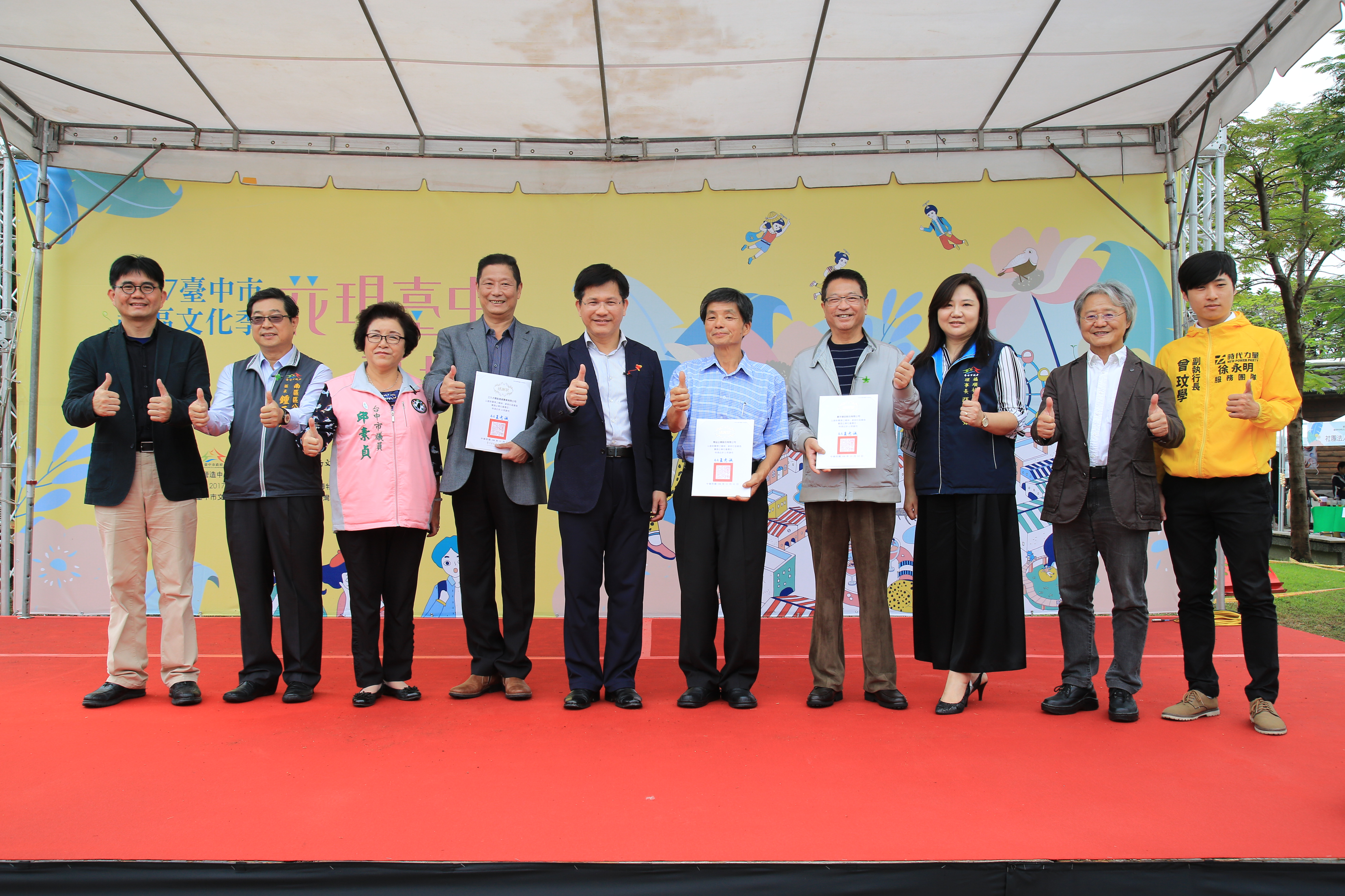 今日典禮除為「社區上台趣」劇展獎項和「來拍在台中的故事-2017年台中市社區營造影像徵選」等獲獎者頒獎外,由文化局徵選「不老伴遊」的20位熱心銀髮族也一同接受表揚;林市長在文化局長王志誠的陪同下頒獎感謝社造輔導老師及參與企業,氣氛熱鬧溫馨,文化部文化資源司司長陳登欽及市議員邱素貞也到場見證。