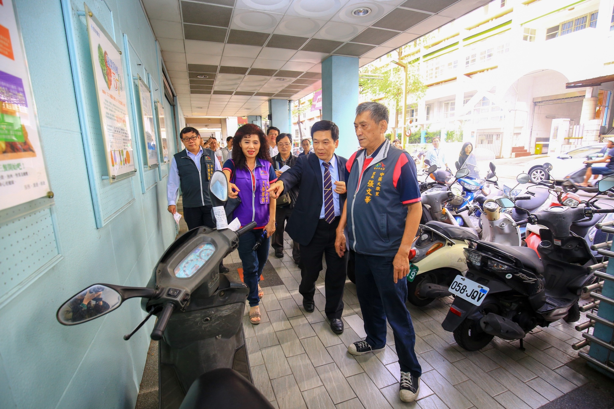 黃秘書長今日在中區區長黃至民及當地里長的陪同下,帶領建設、都發、交通、警察及區公所等相關單位,前往第三波執行路段中區光復路,針對騎樓違規占用及停放汽機車等情形進行聯合稽查,發現有整修中的商店騎樓高出兩側約30公分,黃秘書長請區長協助店家向都發局申請騎樓整平,另針對騎樓違停及擺放花盆可能影響行人通行的情形,分別由警察局開單查報及請里長協助勸導。