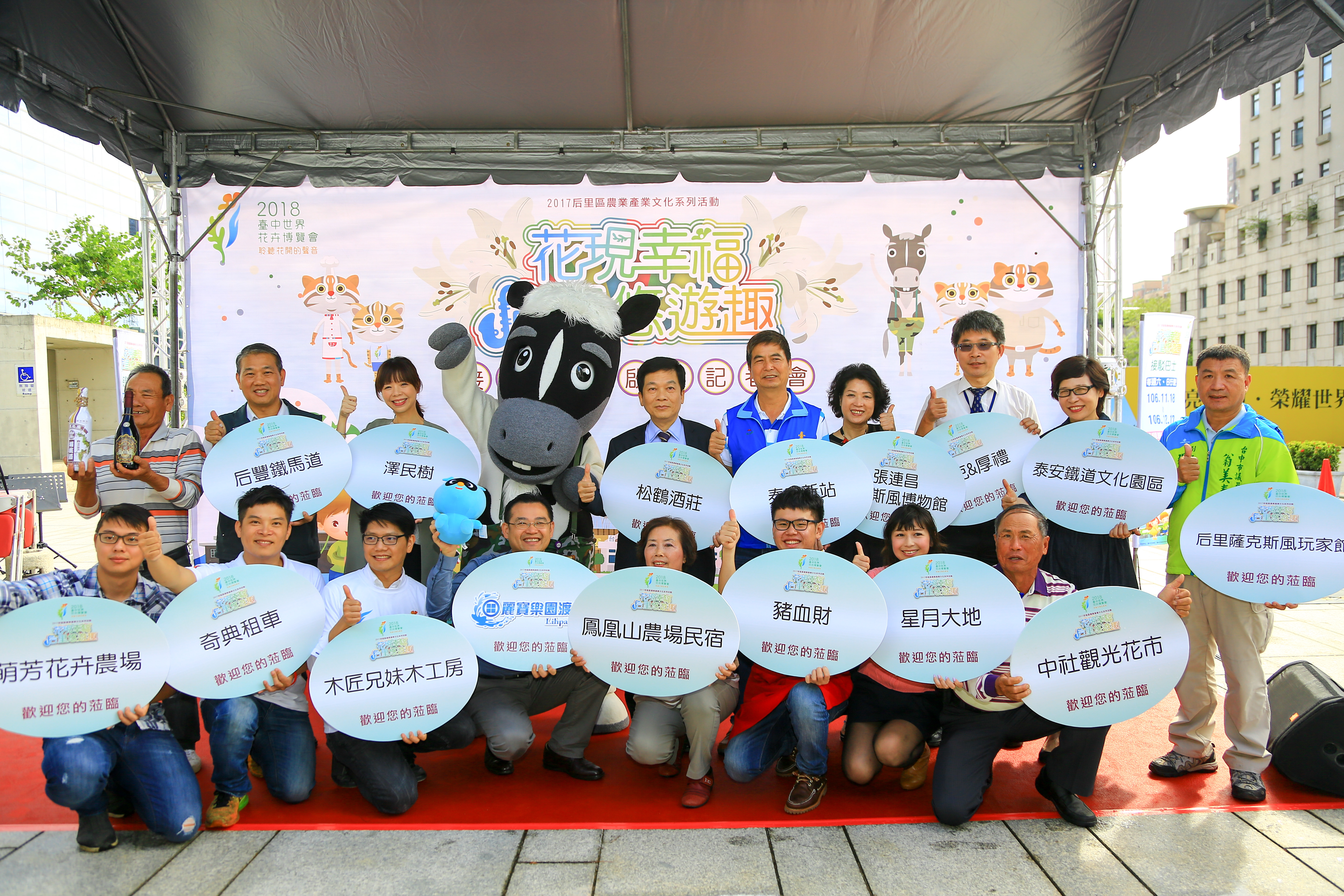 黃秘書長表示,后里是宜居小鎮,包括薩克斯風、花卉、酒莊等產業都非常出名,透過這次接駁巴士及隨車導覽,介紹后里重要景點,包括麗寶樂園、星月大地、張連昌薩克斯風博物館、后豐鐵馬道、泰安鐵道園區等,讓全國民眾更加認識后里的人文風情;尤其后里是2018台中世界花卉博覽會最大展區,花博吉祥物石虎家族也會不定時隨車同樂,為明年花博宣傳。