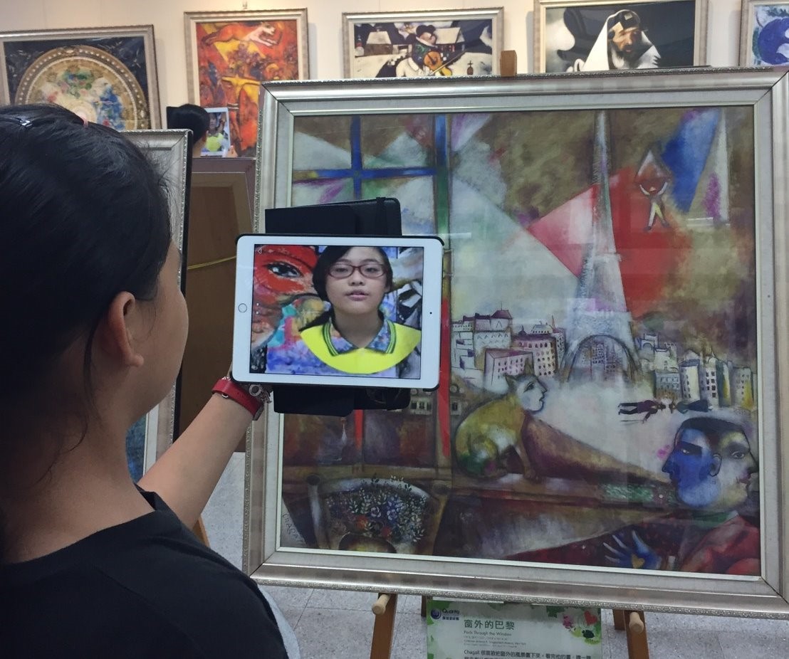 在畫展導覽部分,大鵬國小首次結合AR技術,由校內的藝術導覽小尖兵錄製導覽解說影片。運用AR技術,參觀者只要將自己的手機或平板電腦對準畫作就可以看到學生運用擴充實境進行夏卡爾35幅畫作的影音導覽解說。該校高年級學生也利用行動載具設計出畫作拼圖互動遊戲,藉由會場配置的75吋觸控大螢幕及25部平板電腦,讓參觀者能與畫作進行拼圖遊戲的操作。