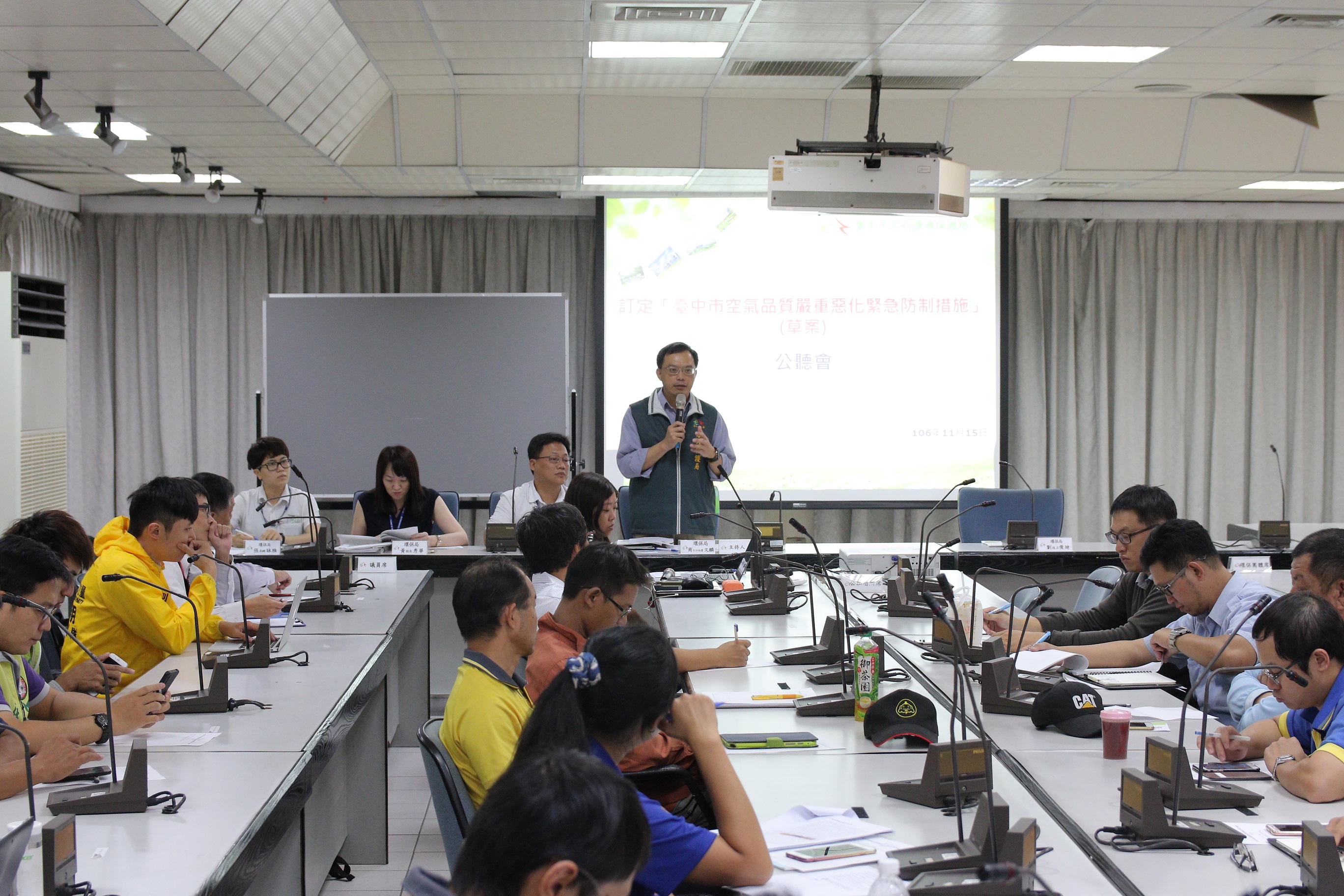 台中市政府環保局今(15)日在台中州廳舉行「空氣品質嚴重惡化防制措施草案」公聽會,廣邀關心空汙各界人士與會。環保局指出,市府依據AQI空品惡化5級別,將學校停止戶外活動及運動競賽、成立防制指揮中心、工廠配合降載及停班停課等應變措施納入草案中實施;台中是目前全國唯一召開公聽會的縣市,今日民眾所提出的建議將納入參考,希望將空汙危害降到最低。