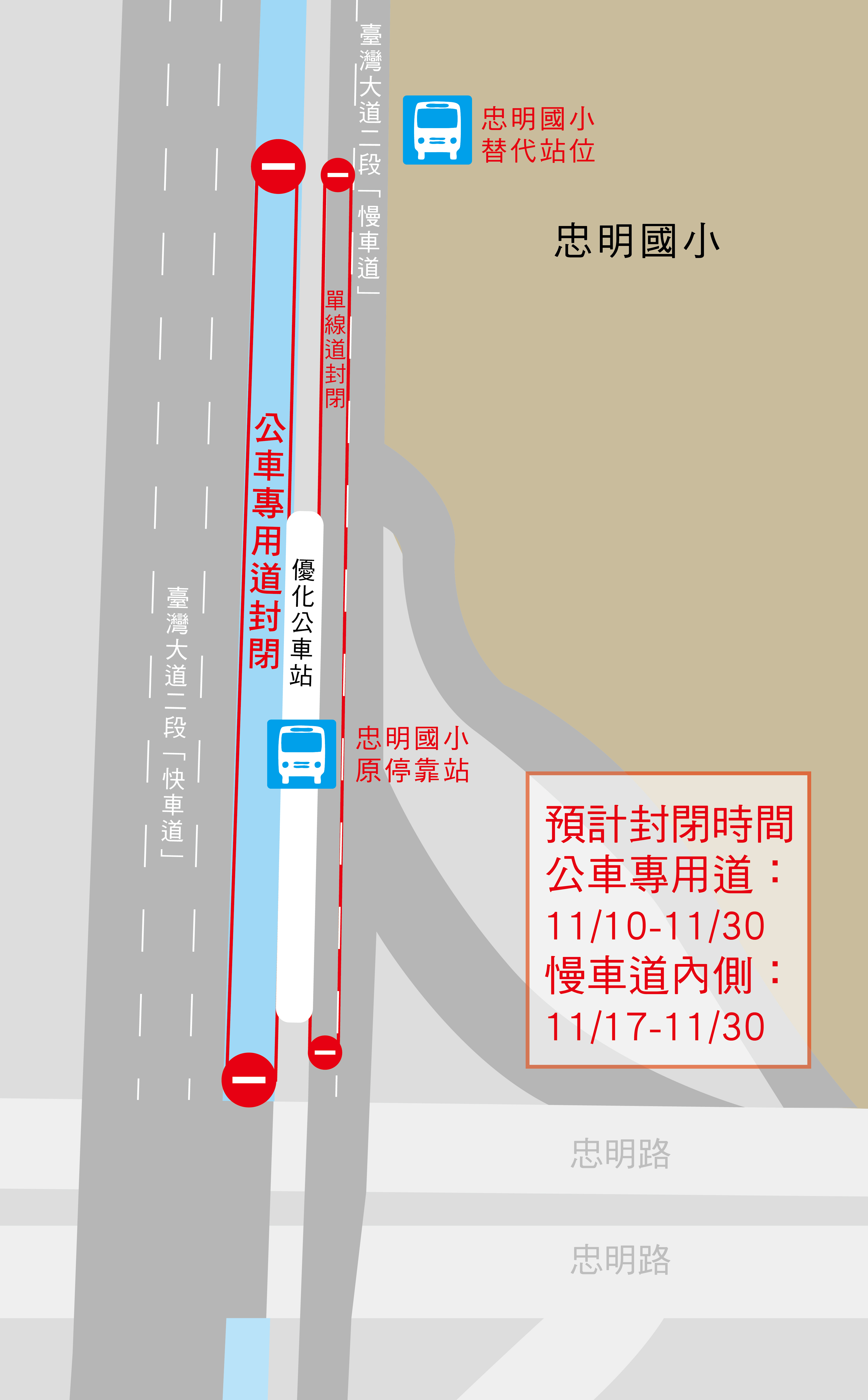 新聞局指出,考量公共安全,11月17至11月30日彩繪作業期間將持續封閉優化公車站-忠明國小站(往靜宜大學),原行駛公車專用道公車301、302、303、304、305、306、307、308、A2調整至慢車道忠明國小站上下客,比較特殊的是,300、309路屬雙節公車,因該路段慢車道狹窄,將不行駛停靠慢車道站位,直接行駛下一站頂何厝站停靠,提醒多加留意。(11/16*6)*新聞局
