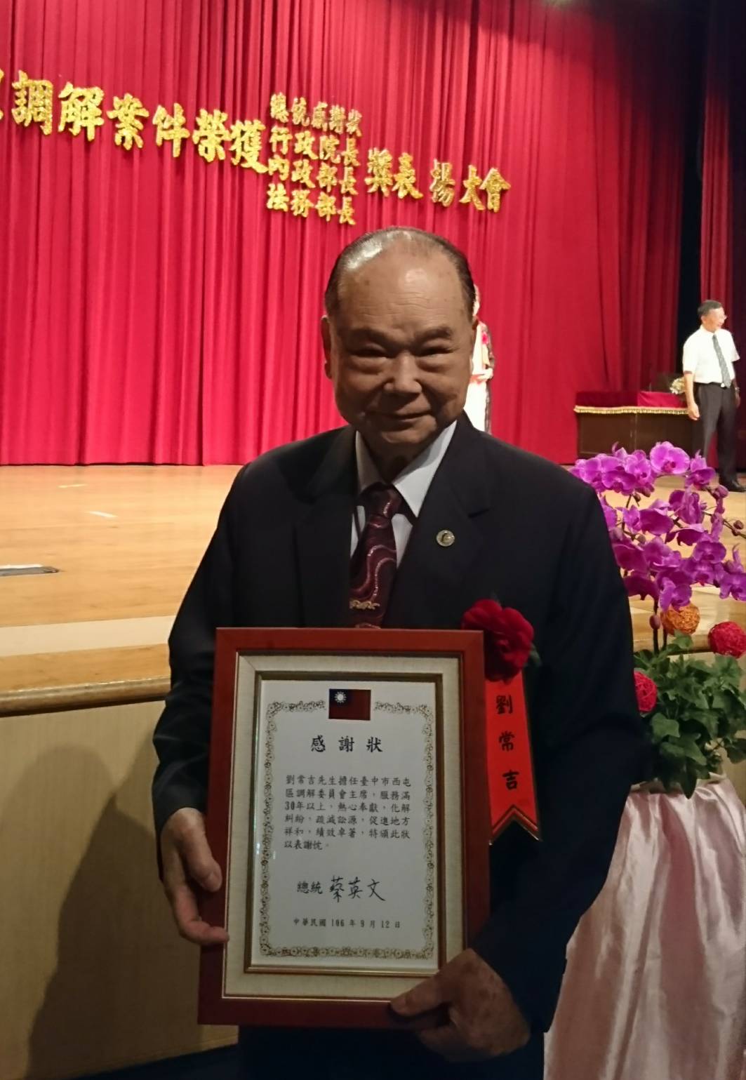 區長何國裕指出,調解主席劉常吉、委員廖繼順及廖學澍都曾榮獲行政院長獎表揚,致力於調解業務已逾20年,長期為民眾排解紛爭,造福鄉里,特別是劉主席堪稱國寶級調解委員,服務年資超過43年,除了在公所擔任調解主席,同時兼任台中地方法院調解委員,並於今年榮獲總統感謝狀最高榮譽表揚,市長林佳龍也在日前接見並頒發紀念獎座,表達對資深調解委員的肯定。