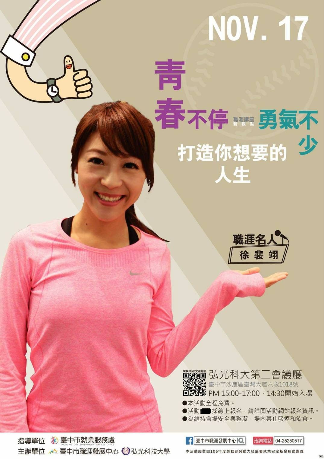 光鮮亮麗的新聞主播是許多女性心目中夢想排名第一的職業,但曾任主播的徐裴翊卻有不同選擇;當年徐裴翊毅然離開熟悉的主播台,開啟人生創業的旅程,設立Vamos Sports運動影音新媒體公司,專業報導台灣運動員、運動賽事及休閒活動,開創人生另一個精彩階段。今(17)日下午3時,徐裴翊受台中市職涯發展中心邀請,到弘光科技大學分享圓夢路途上遭遇的酸甜苦辣,歡迎踴躍前往聆聽。