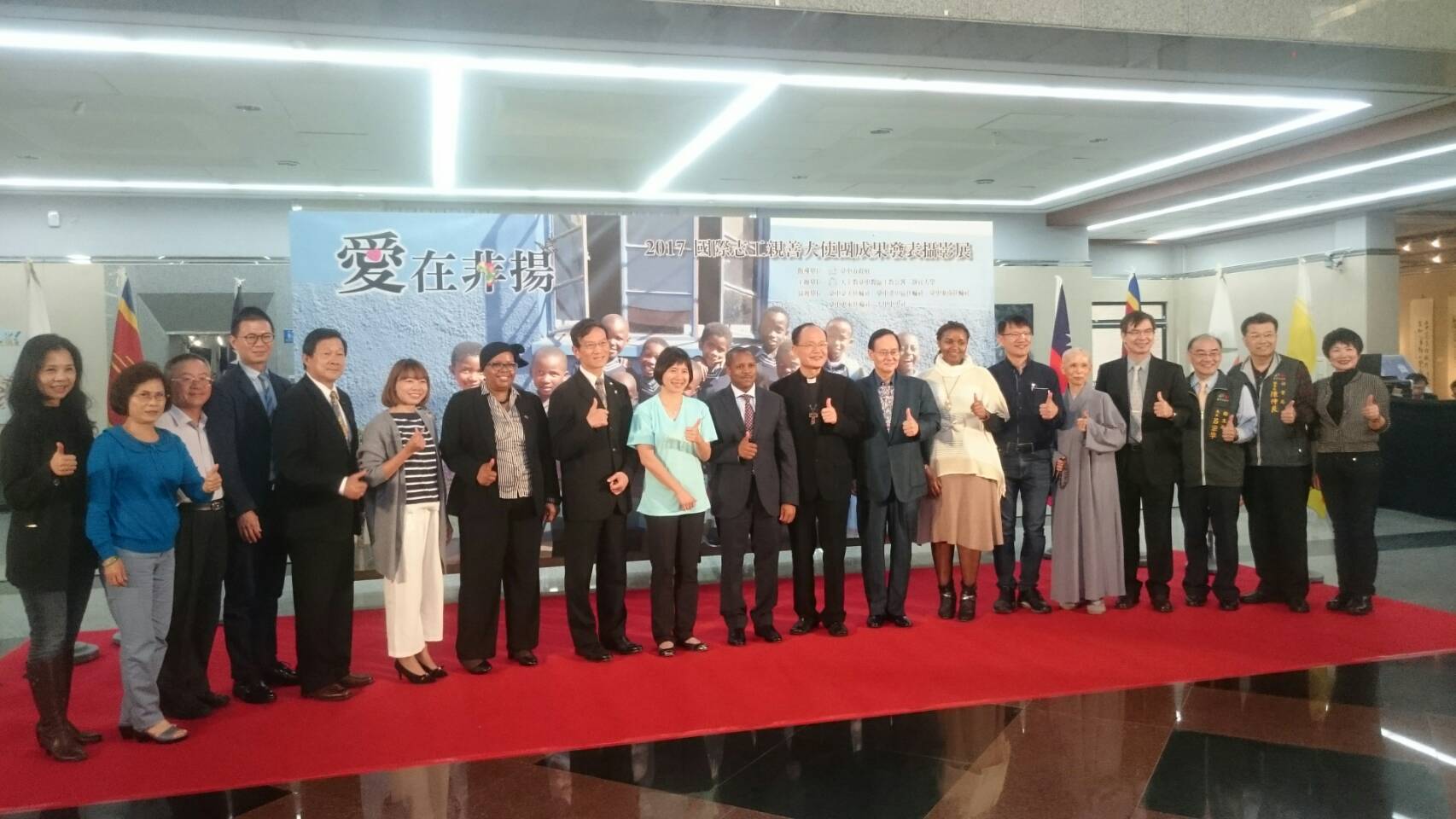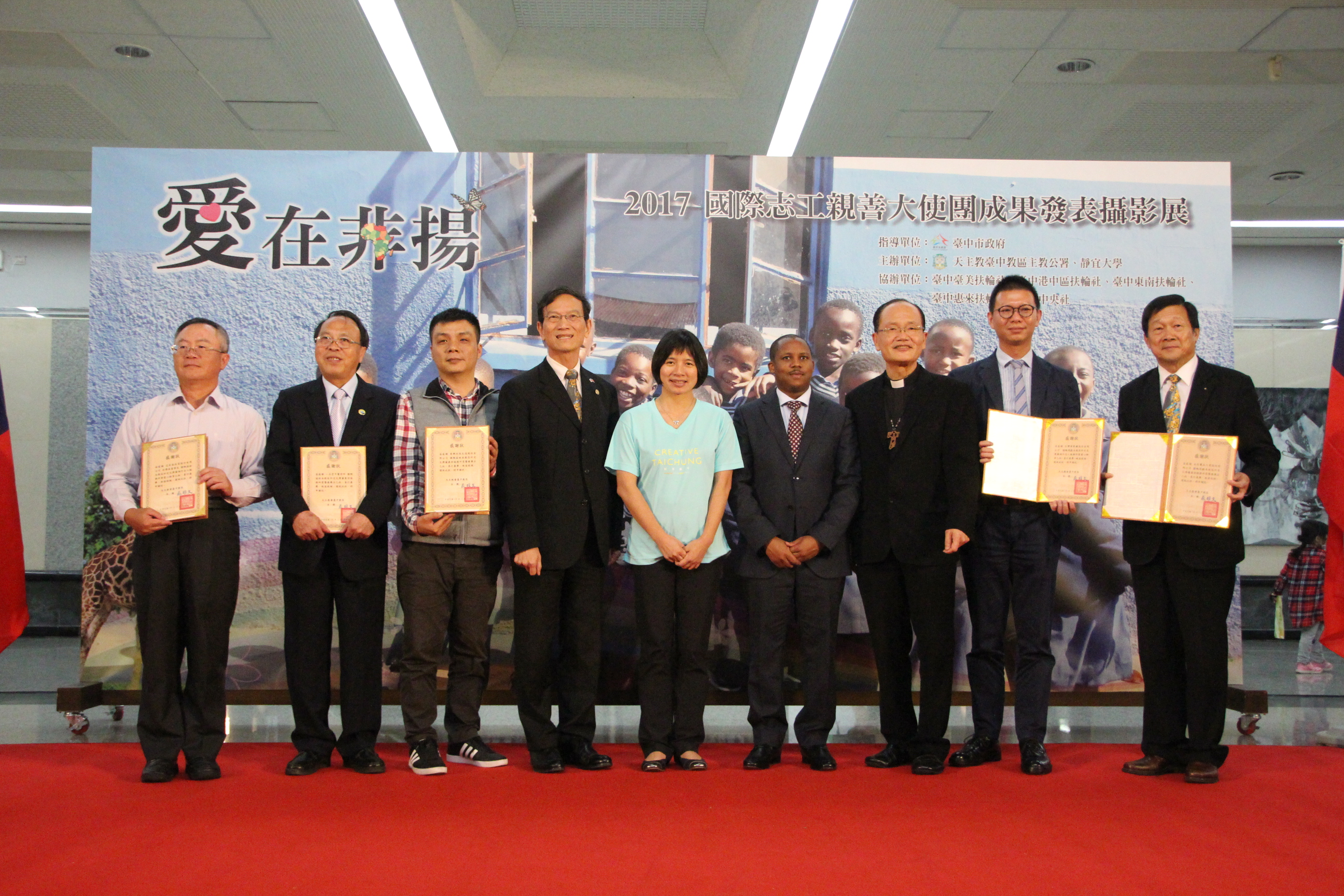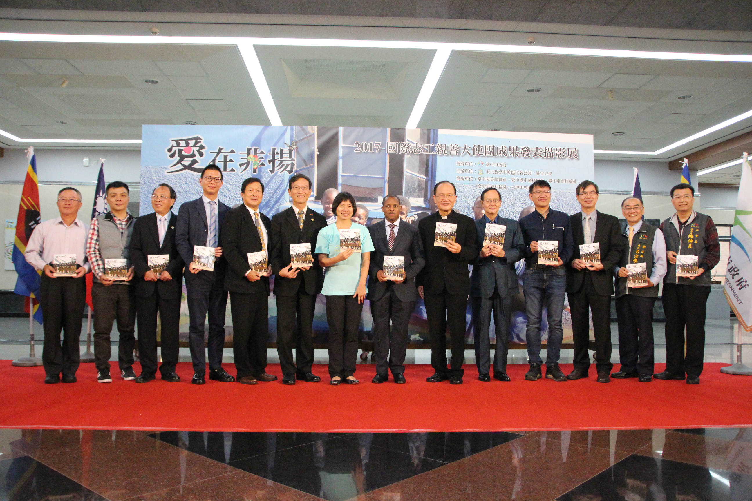 今(19)日於港區藝術中心舉行「愛在非揚-2017國際志工親善大使團成果發表攝影展」開幕記者會,包括副市長林依瑩、衛生局長呂宗學、社會副局長陳仲良、教育局專委黃瀞儀、天主教台中教區主教暨靜宜大學董事長蘇耀文主教、史瓦濟蘭王國大史Thamie Dlamini及多位企業界代表均出席共襄盛舉。