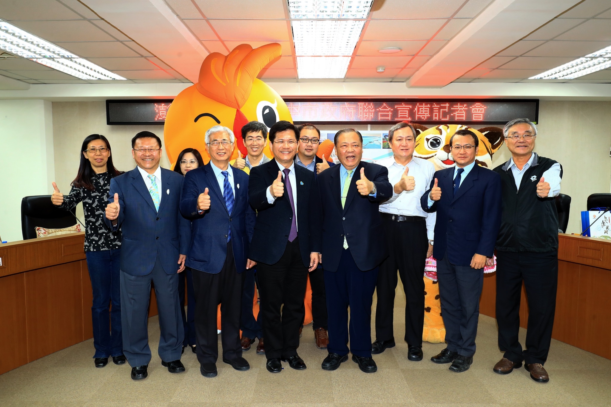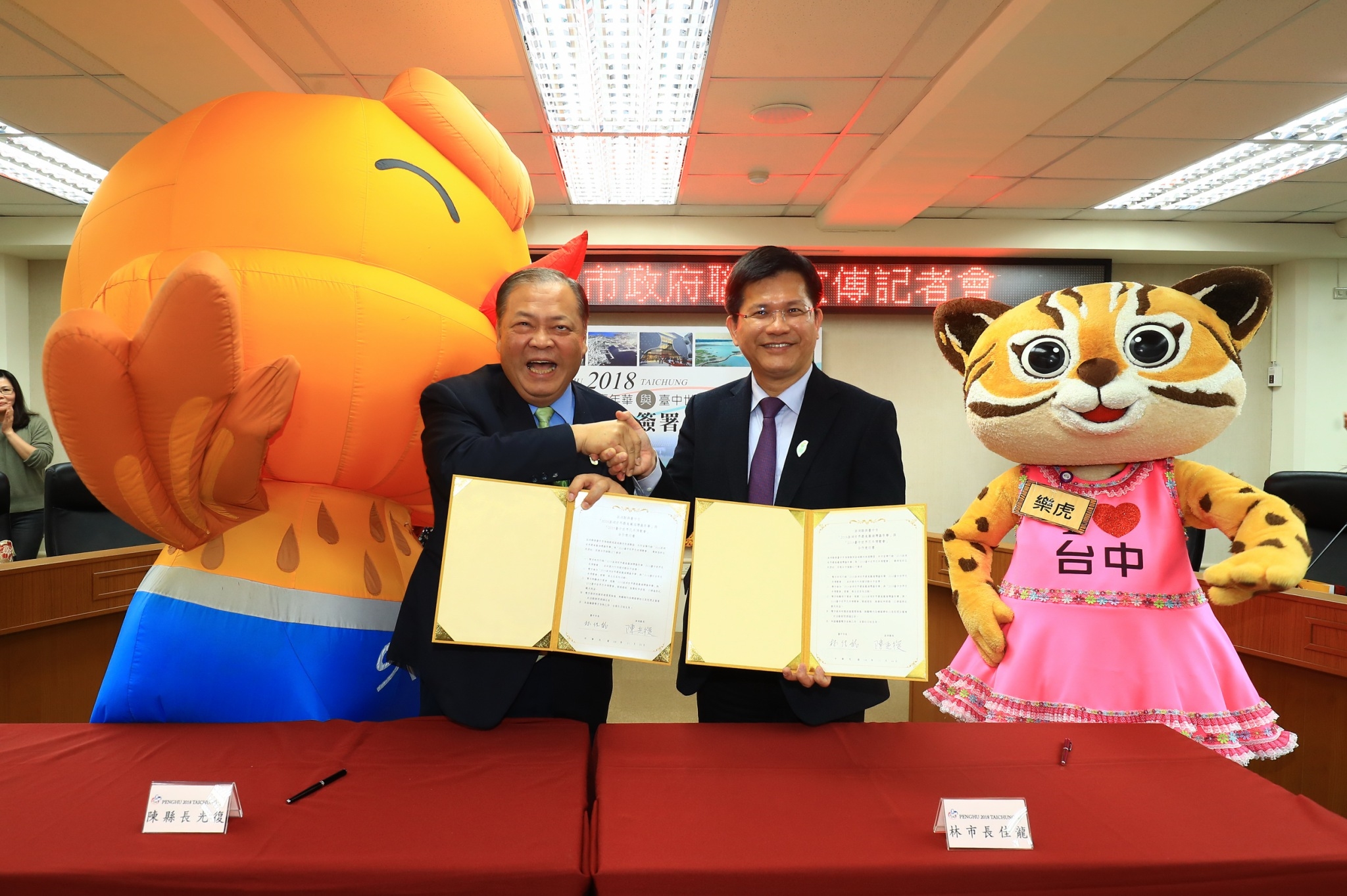 林市長今日率領市府觀光旅遊局長陳盛山、建設局長黃玉霖、農業局長王俊雄一行人,以及花博吉祥物「樂虎」前往澎湖,與澎湖縣長陳光復共同簽署「2018澎湖世界最美麗海灣嘉年華與2018台中世界花卉博覽會」合作意向書;林市長與陳縣長也當場交換活動徽章,象徵雙方將共同行銷這兩大盛會,參與彼此活動開幕、展出及其他系列活動。