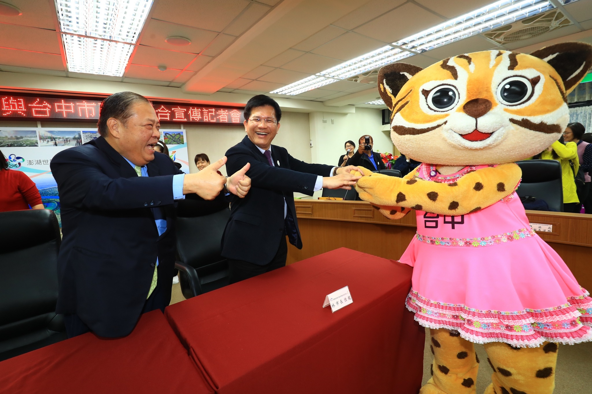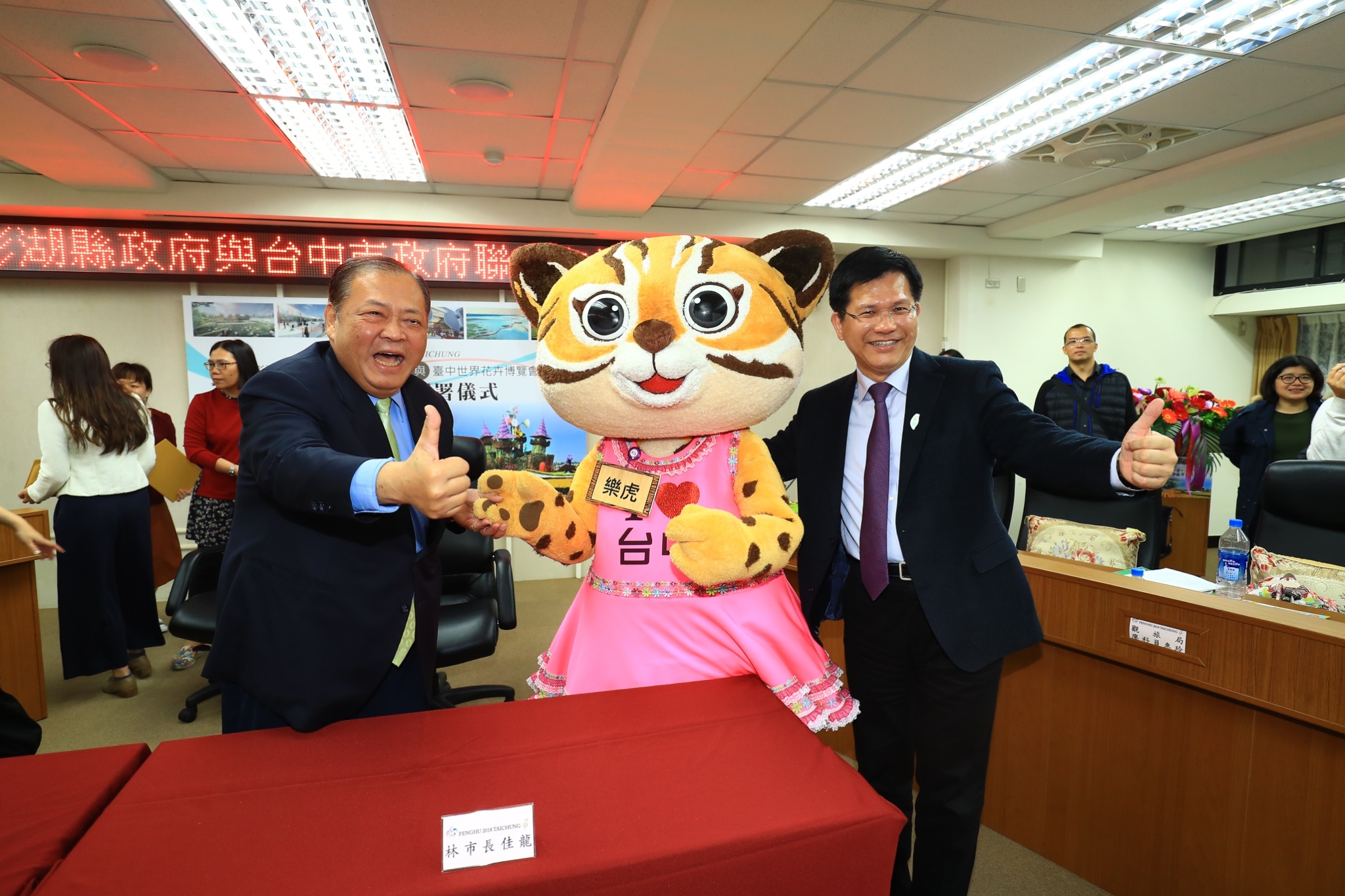 台中市2018年將舉辦世界花卉博覽會,澎湖同年也將舉辦「2018澎湖世界最美麗海灣嘉年華」,今(24)日市長林佳龍帶領第一次出訪離島的「樂虎」姊姊飛往澎湖,與澎湖縣長陳光復簽署合作意向書,宣示將緊密合作聯合行銷宣傳明年度台灣兩大盛會,擴大吸引國內外觀光客到台中及澎湖旅遊,為區域合作再創新的里程碑,除了聽見花開的聲音,也能飽覽世界最美麗的海灣美景。