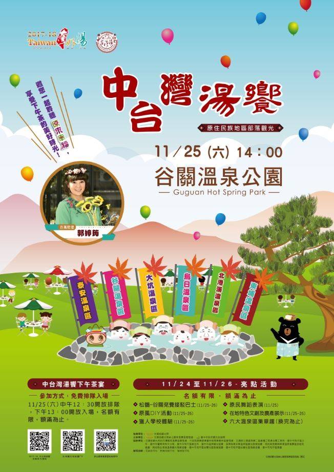 「中台灣湯饗」系列活動將於11月24日至26日在谷關溫泉區登場!今年首次結合泰安、大坑、谷關、烏日、東埔及北港溪等中台灣6大溫泉區,提供多元泡湯選擇,25日將以「原風下午茶宴」展開序曲,有泰雅原民歌舞、台語歌手郭婷筠等表演,當日中午前於谷關溫泉公園現場排隊,還可免費享用貓頭鷹餅乾、五葉松汁、搗麻糬,精彩可期;11月25日在台中都會公園將舉辦「揪毛小孩撒野趣」野餐活動,現場有兒童話劇、樂團表演、園遊會、毛小孩認養等,歡迎共襄盛舉!