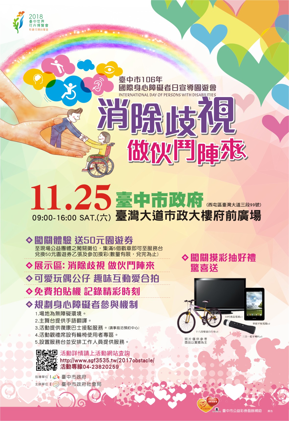 而11月25日上午9時起,在台灣大道市政大樓府前廣場,將舉辦「台中市106年國際身心障礙者日宣導園遊會」,近百個身障團體擺攤,提供各類美食手藝品,還有展身障朋友帶來的精彩表演,現場闖關體驗送限量50元園遊券,還可參加摸彩將液晶電視、華碩平板電腦等大獎帶回家!詳細資訊都在活動網站( http://bit.ly/2A5Rebx )。本週還有不少展覽、演講等活動,更多資訊,請見「中市週末活動看板1125_1126」。(11/24*6)*新聞局
