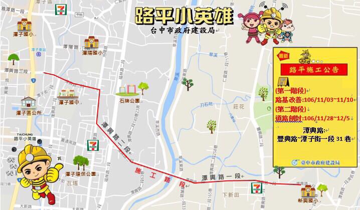 潭興路一、二段為潭子區重要東西向聯絡道路,因路面因長期車輛頻繁壓輾,造成路面凹凸不平,加上人孔蓋密佈,嚴重影響用路人安全。台中市政府建設局發現問題後立即納入路平專案,協調管線單位孔蓋下地,並辦理側溝整平、路基改善等先期施工作業,預計於11月28日至12月6日進場,施作路面刨鋪工程,一次性施工解決道路各項問題。