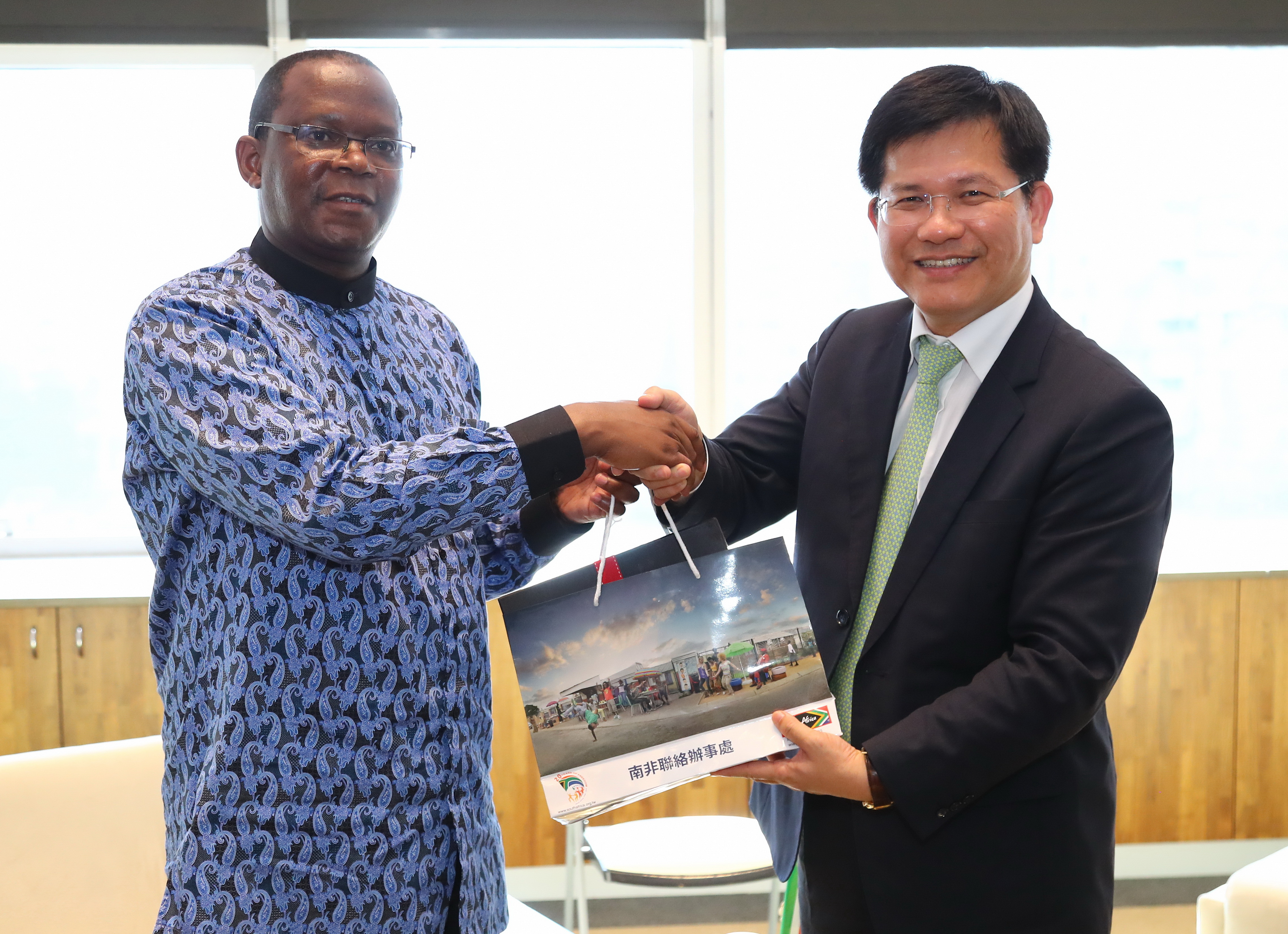 林市長今日在市府農業局長王俊雄、經濟發展局副局長李逸安、台中市工商發展投資策進會總幹事蔡世寅的陪同下,接見南非駐台代表麥哲培(Mr. Matsebe)、副代表馬貝莎 (Ms. Mabasa),雙方針對未來可能交流合作事項進行意見交換,氣氛融洽;會後林市長致贈花博茶舟、鳳梨酥禮盒予麥哲培代表,而麥哲培代表也回贈介紹南非多元創意文化的圖書。