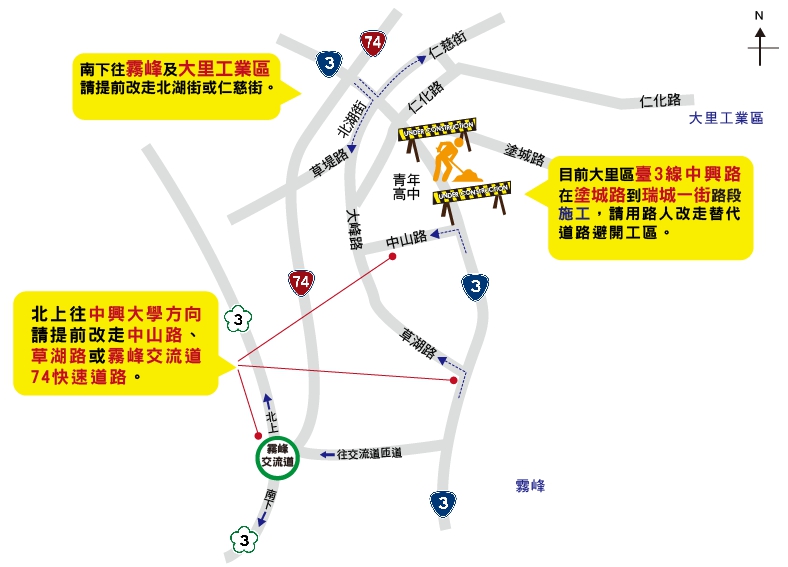 水利局提醒用路人,明日起大里區台3線中興路一段(塗城路到瑞城一街)雨水下水道工程施工,道路將有部分限縮,北上往中興大學方向可改走中山路、草湖路或霧峰交流道74快速道路;南下往霧峰及大里工業區者,可改走北湖街或仁慈街。施工期間敬請配合交通指揮引導或避開施工路段改道通行。(11/29*17)*水利局