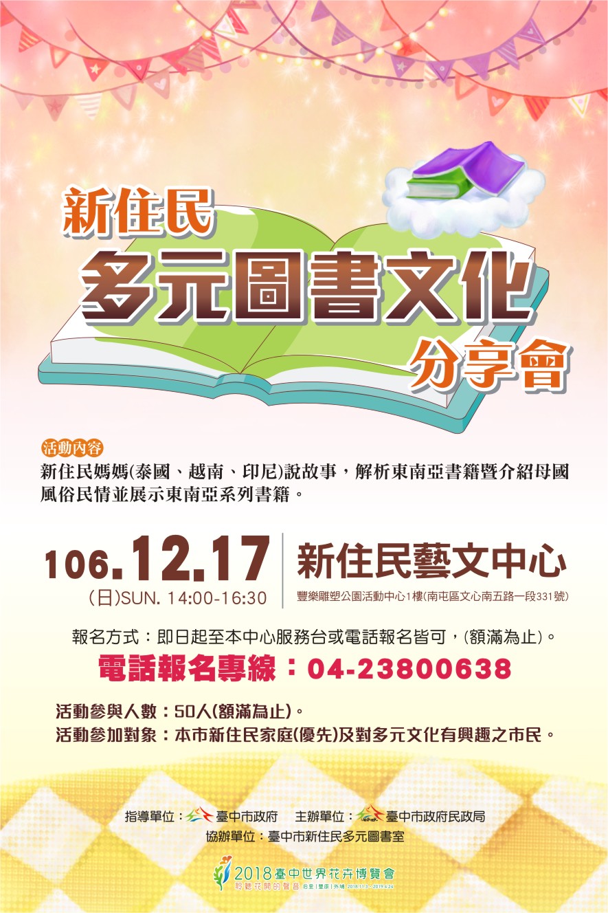 12月17日(星期日)下午2:00至4:30在新住民藝文中心舉辦「新住民多元圖書文化分享會」,開放50名全市新住民家庭(優先)及對多元文化有興趣之市民報名,引領民眾瞭解各國文化之美,歡迎踴躍參加,即日起至本中心服務台或電話報名專線:04-23800638(額滿為止)。