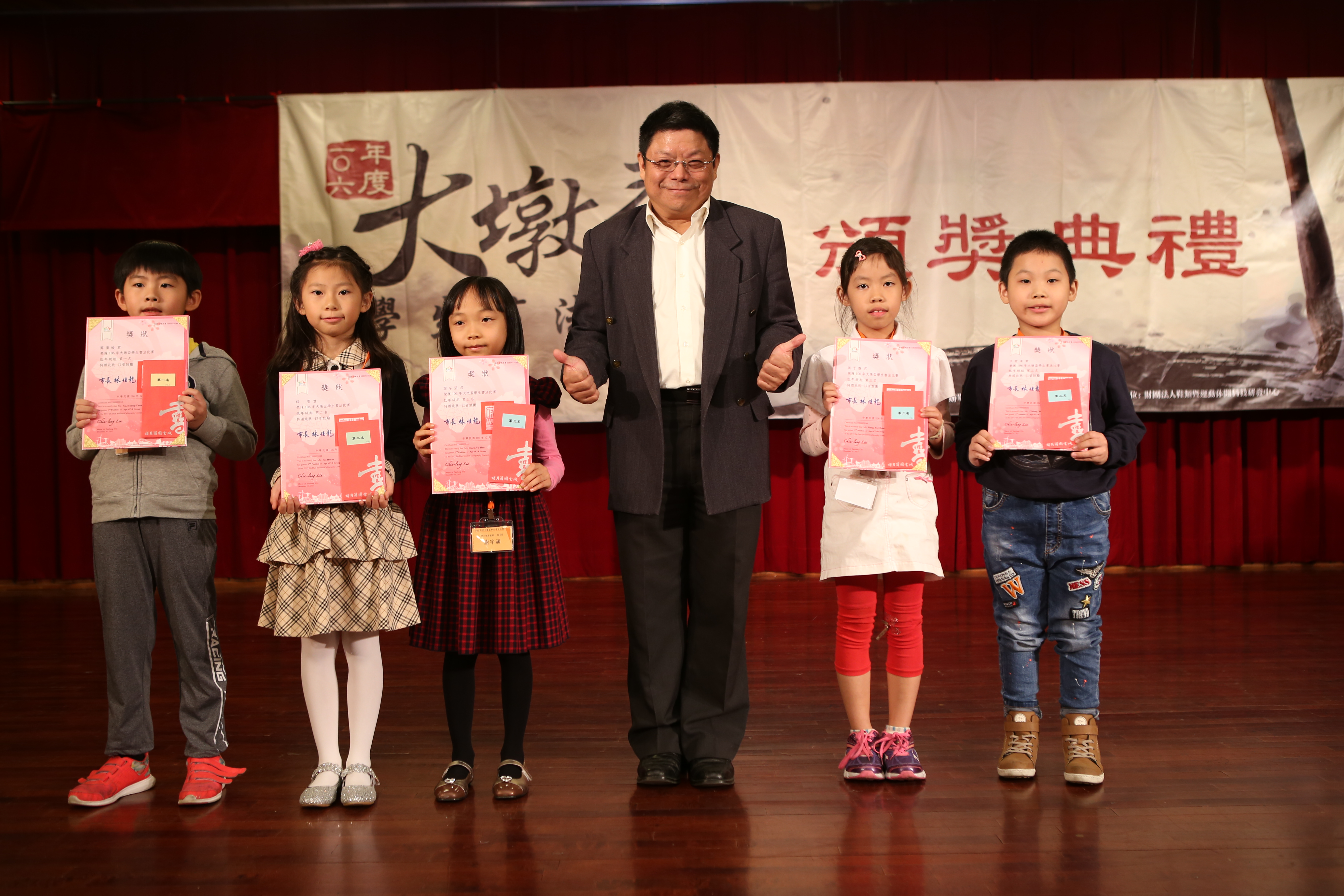 今年各組第一名,國小低年級組:沙鹿國小蘇廣峻;國小三年級組:瑞穗國小陳元正;國小四年級組:西寧國小李沛潔;國小五年級組:龍泉國小徐子媛;國小六年級組:東山國小陳嘉笙