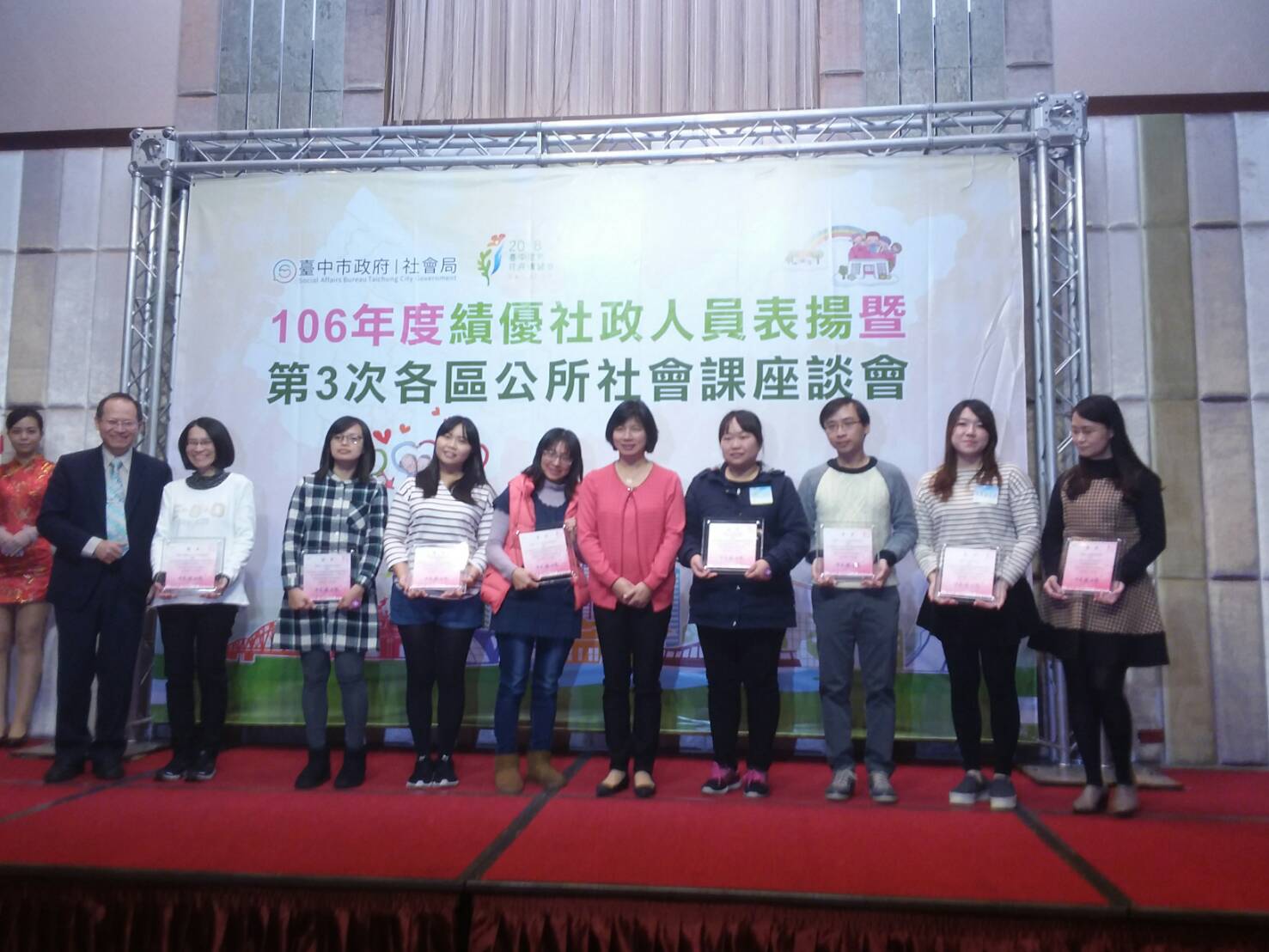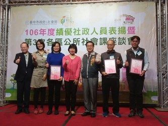「106年度績優社政人員表揚」今(21)日於心之芳庭舉行,今年共有125名績優社政人員及35個社福團體獲獎;其中,有近30年社政服務年資的社會局大甲婦女館館長陳靜珠,經歷過921震災重建、72水災,協助各鄉鎮受災民眾辦理緊急安置、前往勘災及家戶訪視,獲得特殊貢獻得獎肯定。副市長林依瑩感謝默默付出的社政人員與社福團體,期許社政人員與社福團體能繼續在各自的崗位上為民眾提供更好的服務與照顧。