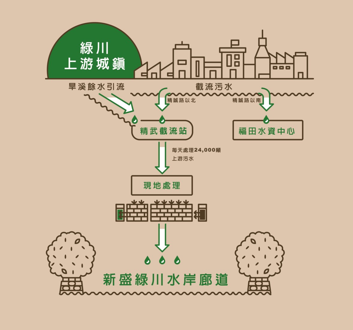 台中市政府水利局積極辦理水域治理,位於台中火車站前的綠川,水質改善是最重要一環,每日截流約2萬4千公噸晴天汙水,淨化後再放流回綠川,可大幅改善綠川水質受汙染情況;此外,綠川設排水箱涵將解決中山綠橋的通洪瓶頸,可增加中山綠橋88%通洪斷面,滿足區域排水25年洪水頻率的保護標準,讓防洪更安全。
