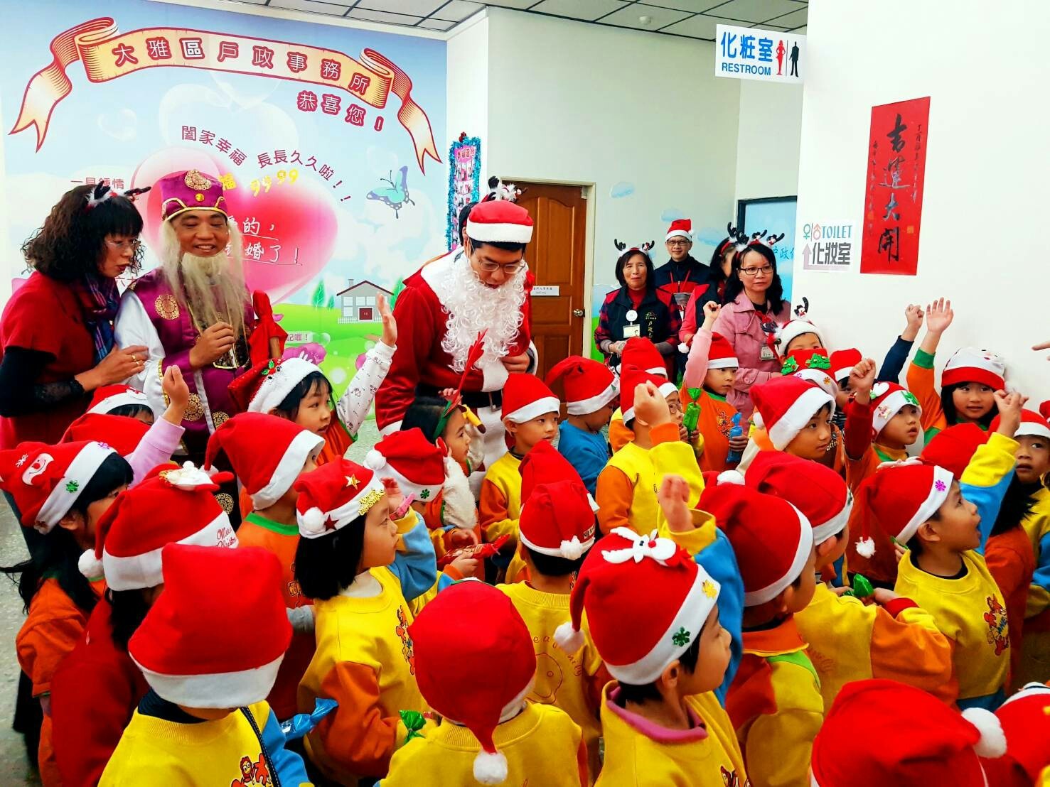 今天是冬至,耶誕節也即將到來,民政局長周永鴻今(22)日發揮創意,一次兼顧兩大節慶,他化身耶誕老人前往大雅戶政所,與扮成麋鹿的大雅區長林宜賢、扮土地公的大雅區戶政主任林勳爵,一起分送熱騰騰的湯圓給洽公民眾。大雅戶政所則邀請幼稚園小朋友「報佳音慶耶誕」,孩子們頭戴耶誕帽,用中英文唱出聖誕歌曲,模樣可愛,讓前來洽公的民眾感受幸福歡樂的氣氛。