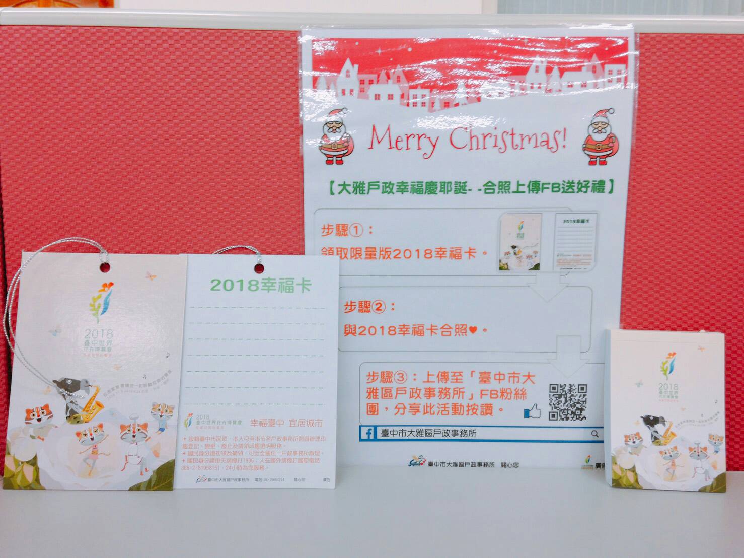 周局長表示,2018台中世界花卉博覽會將在明年盛大登場,在耶誕節來臨之際,大雅戶政所結合花博吉祥物石虎家族與戶政業務資訊,作成「2018幸福卡」,同時宣傳花博與戶政,創意百分百。(12/22*14)*民政局