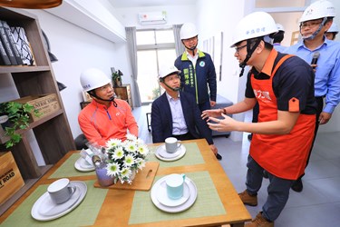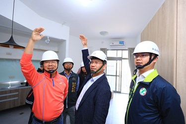林市長今日在都發局長王俊傑、住宅發展工程處長許由興等人的陪同下,視察豐原安康段社會住宅,市議員謝志忠也到場關心,現場展示多款樣品屋設計,有北歐簡約風、工業風、童趣風、台灣歷史文化風格等,相當吸睛。